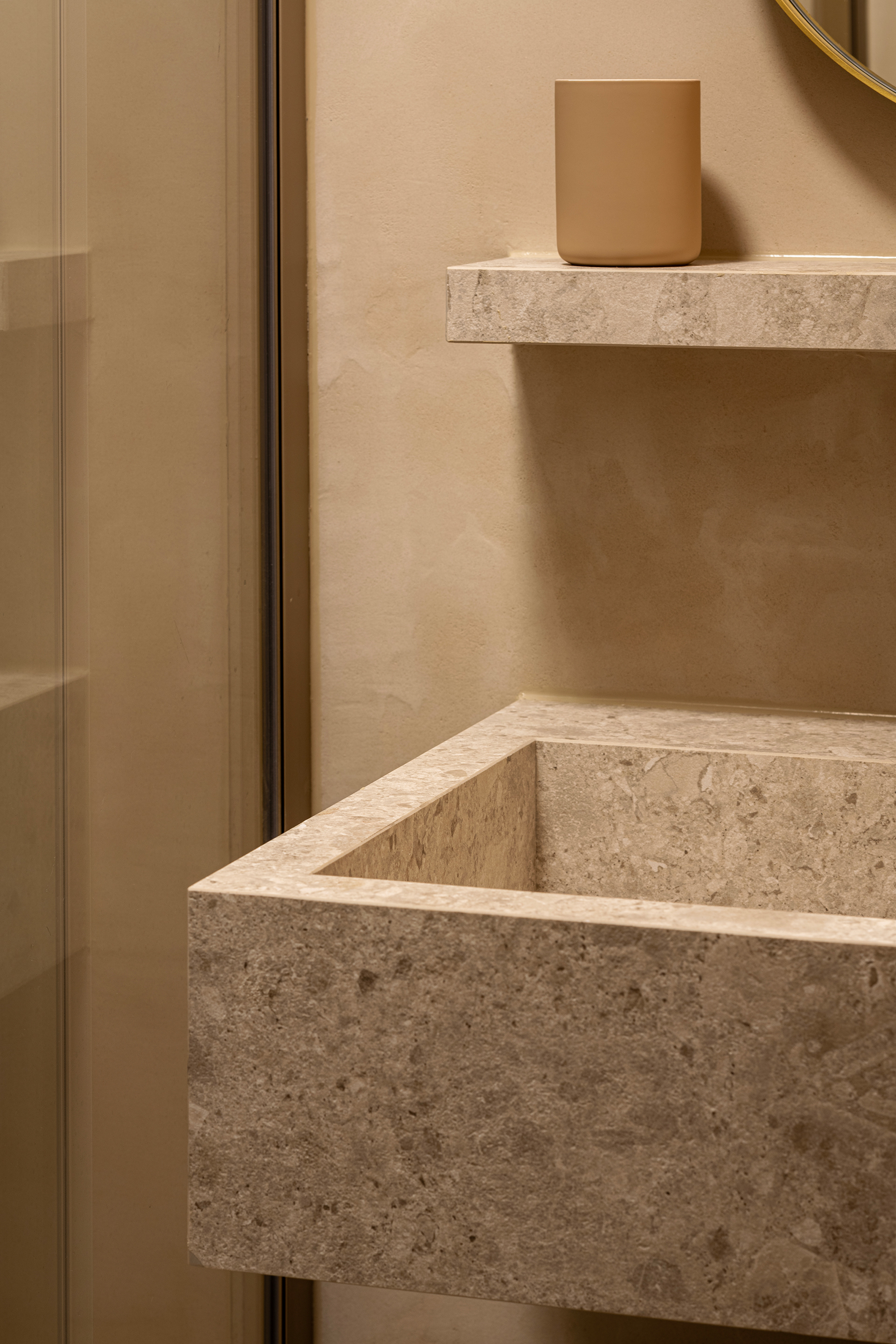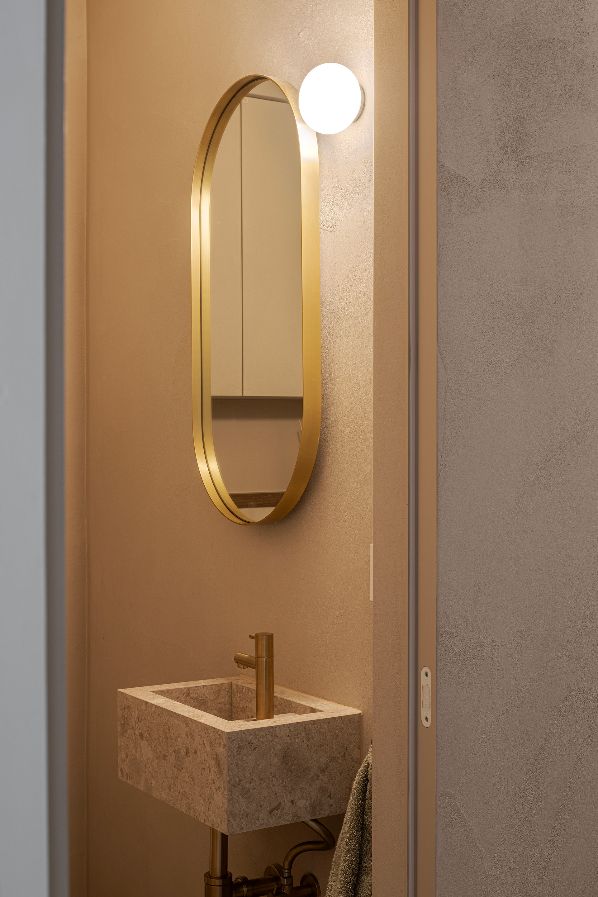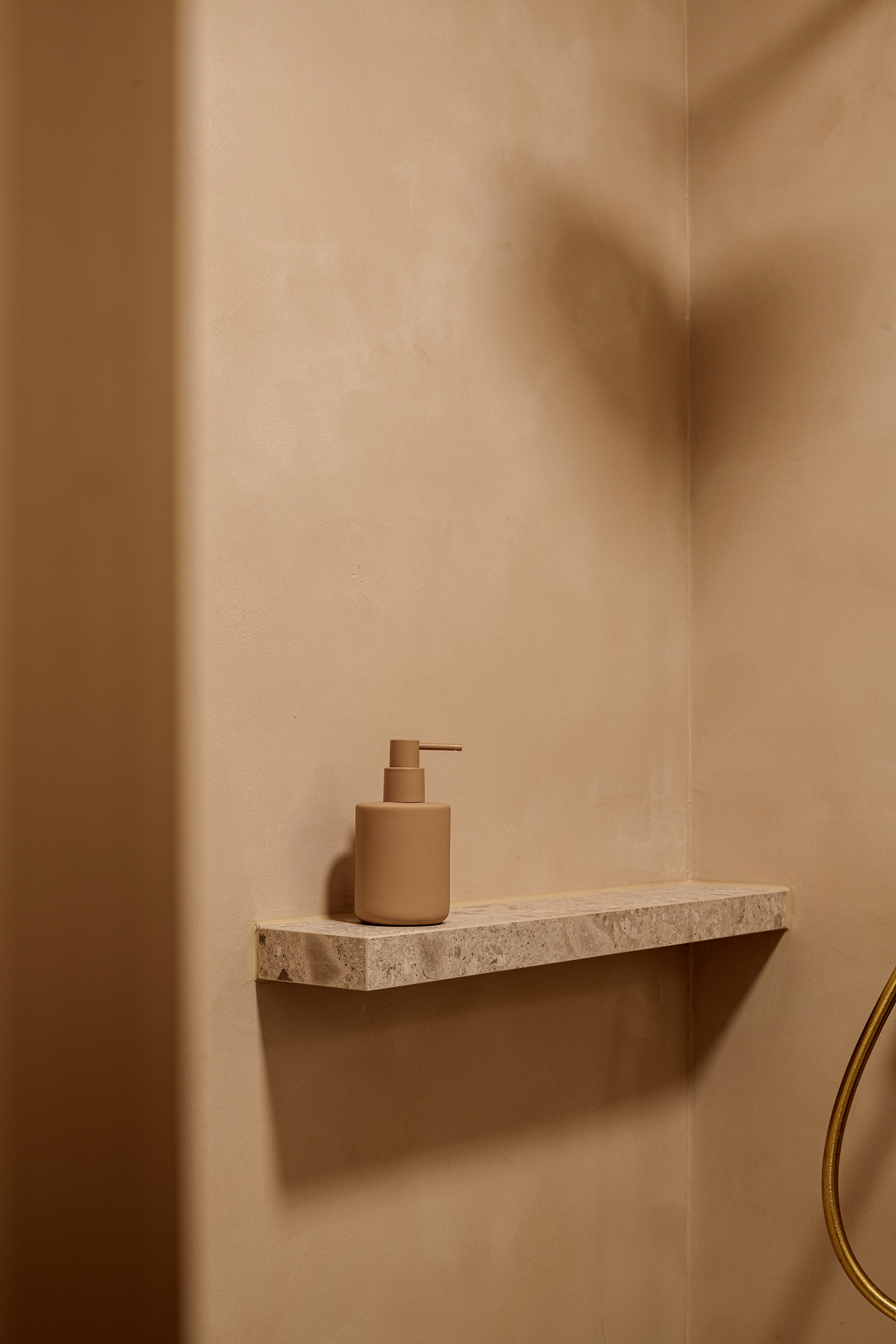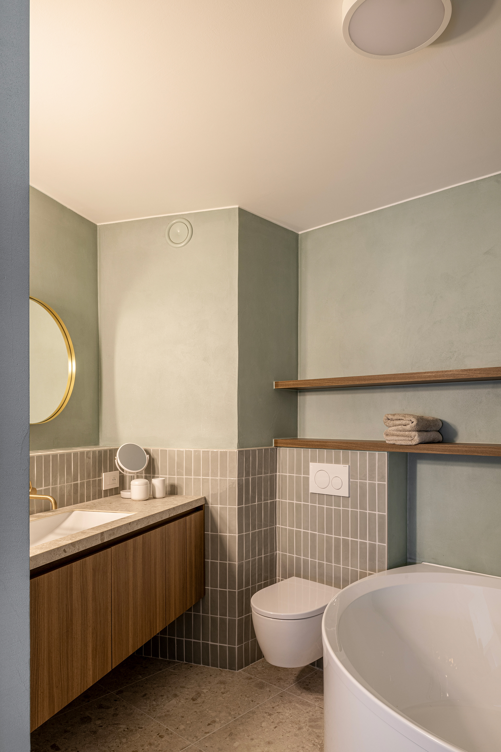 Door te kiezen voor een beperkt aantal warme en tactiele materialen, krijgt het geheel een natuurlijk en rustgevend karakter. Op de wanden werd met een decoratieve schildertechniek kleistuc geplaatst. Doorheen de leefruimtes loopt een eiken visgraatparket. In de keuken en natte ruimtes koos ik voor een keramische tegel met ceppo di gre look. Dit komt ook terug in het opgedikte blad van het haardmeubel en de wastafels in gastentoilet en douchekamer. Voor het maatwerk koos ik een kwaliteitsvolle laminaat met notelaar decor. De master badkamer zorgt voor een kleurrijk accent met salie-kleurig kleistuc en bijpassende wandtegeltjes.