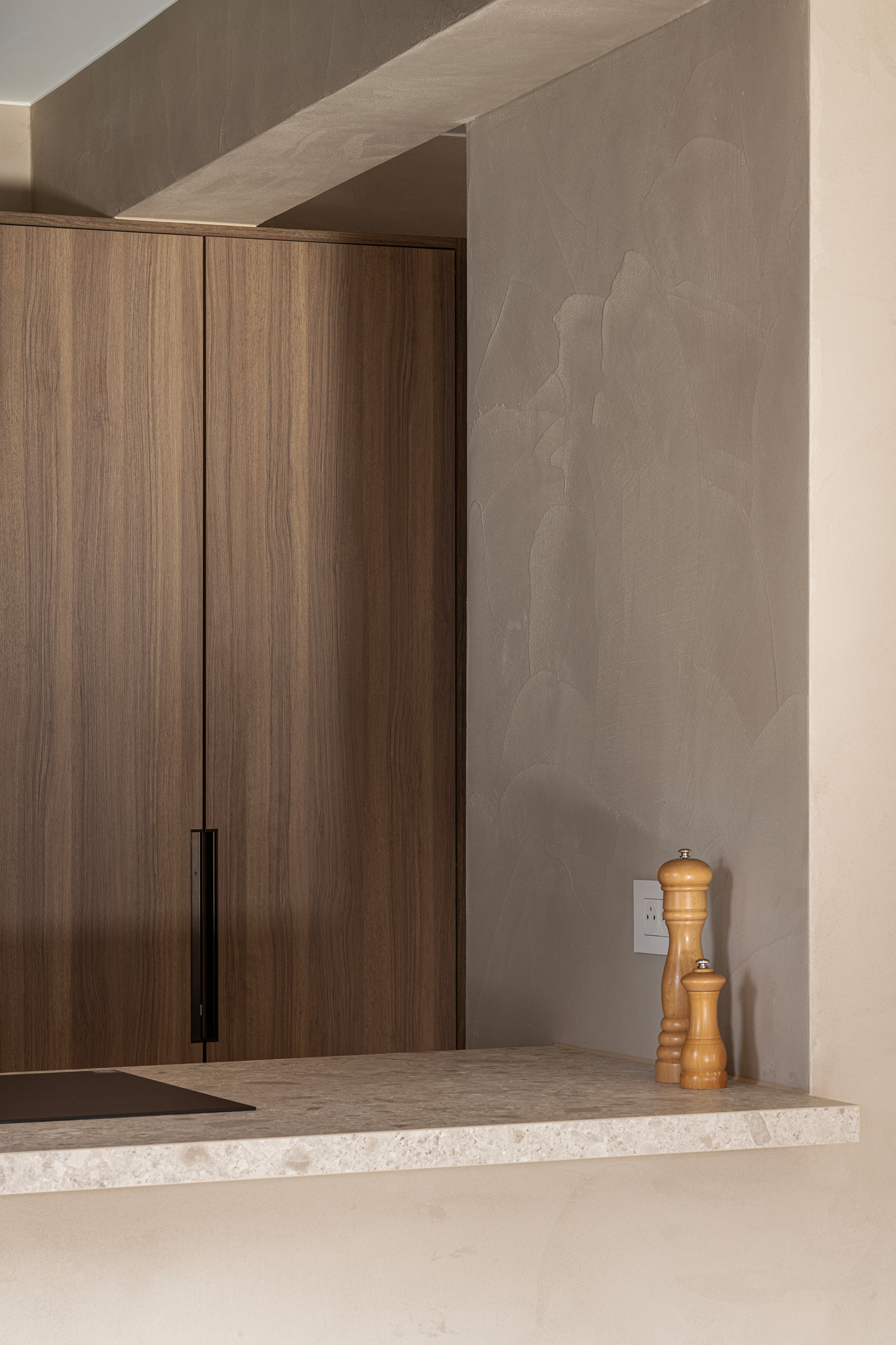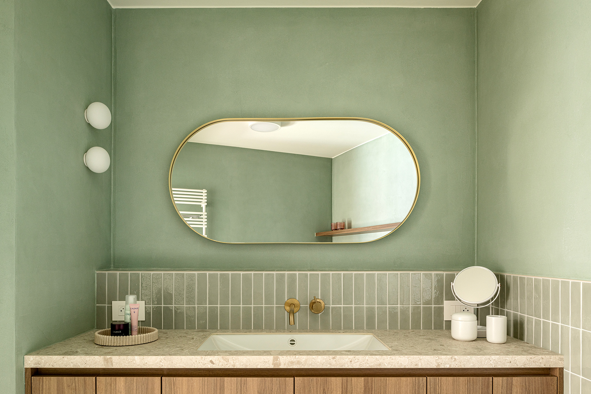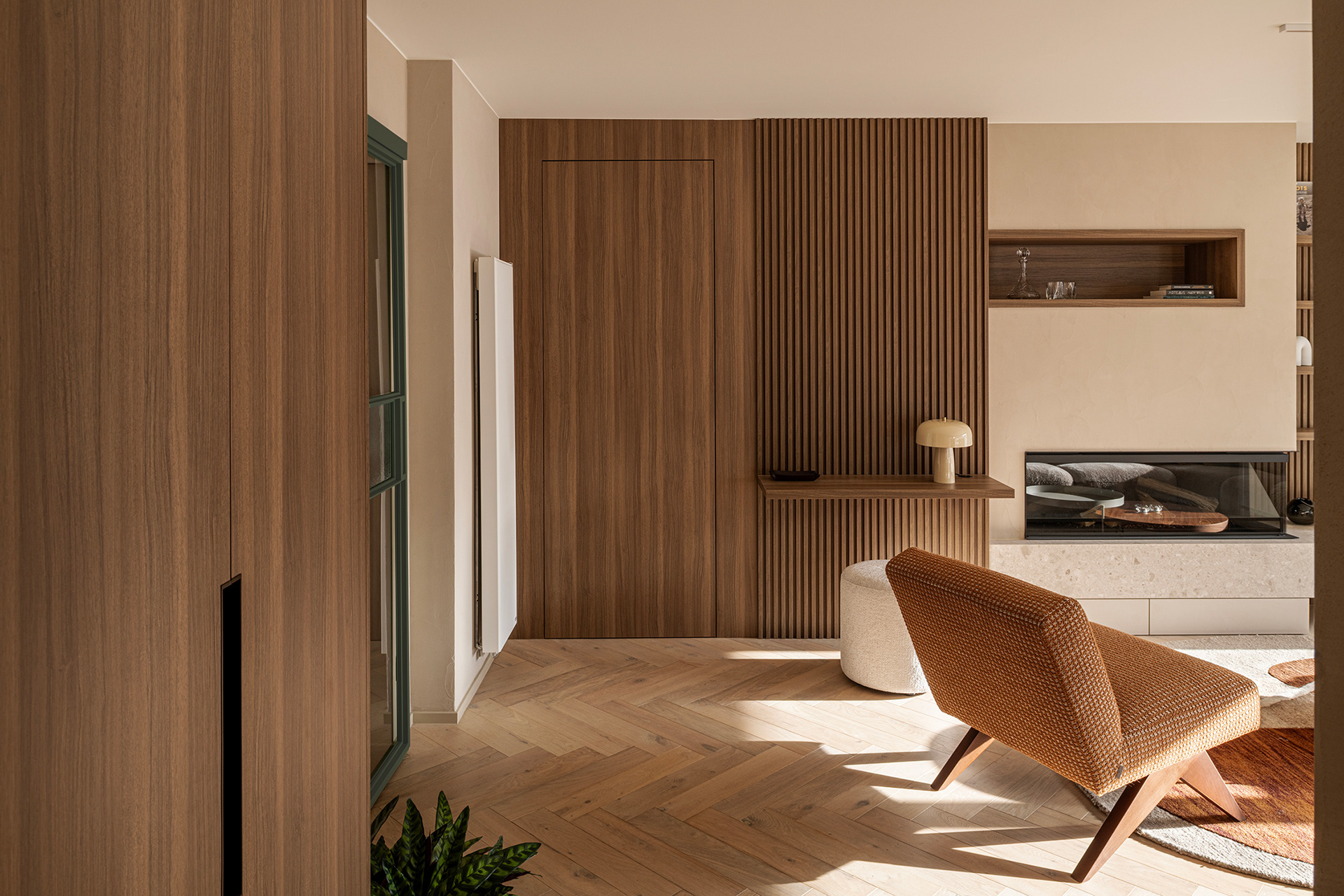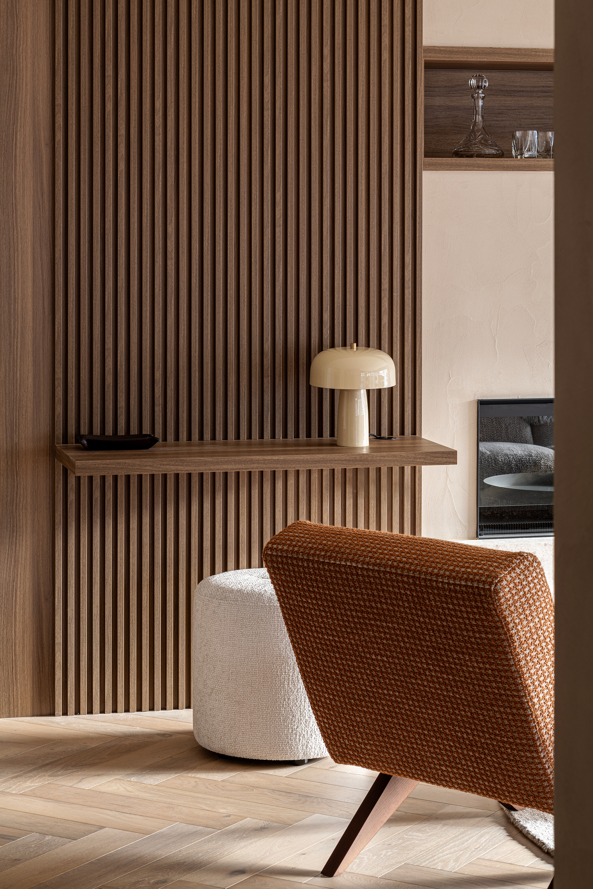 Door te kiezen voor een beperkt aantal warme en tactiele materialen, krijgt het geheel een natuurlijk en rustgevend karakter. Op de wanden werd met een decoratieve schildertechniek kleistuc geplaatst. Doorheen de leefruimtes loopt een eiken visgraatparket. In de keuken en natte ruimtes koos ik voor een keramische tegel met ceppo di gre look. Dit komt ook terug in het opgedikte blad van het haardmeubel en de wastafels in gastentoilet en douchekamer. Voor het maatwerk koos ik een kwaliteitsvolle laminaat met notelaar decor. De master badkamer zorgt voor een kleurrijk accent met salie-kleurig kleistuc en bijpassende wandtegeltjes.