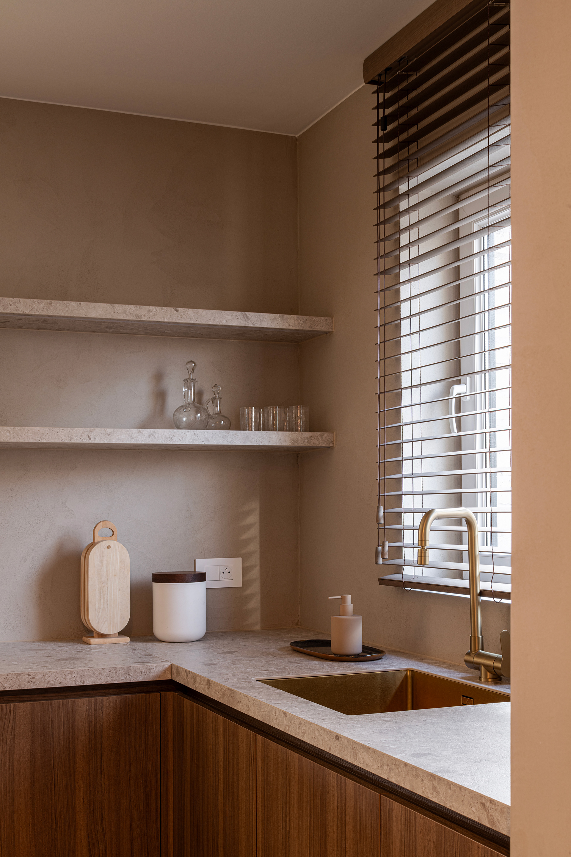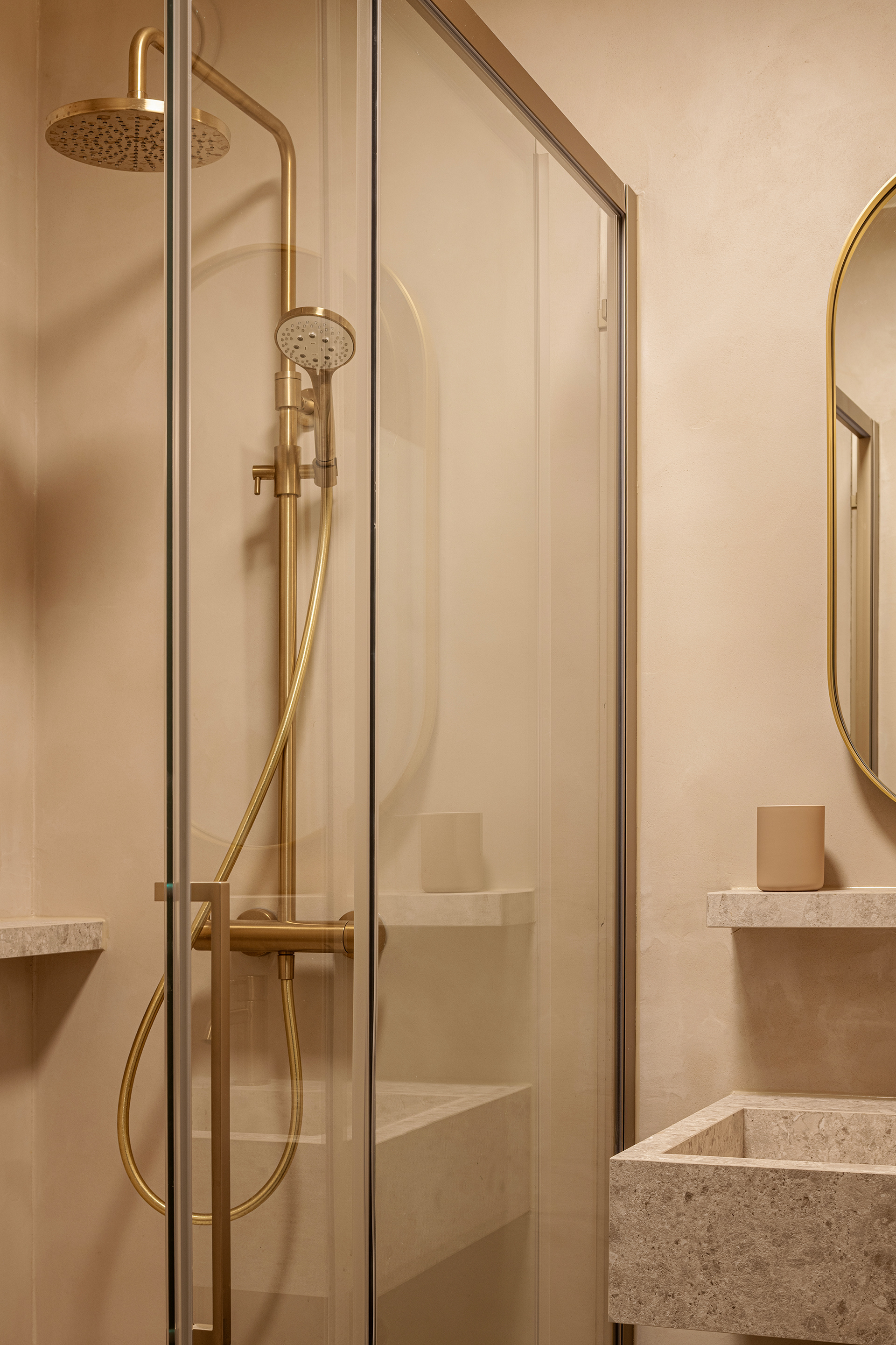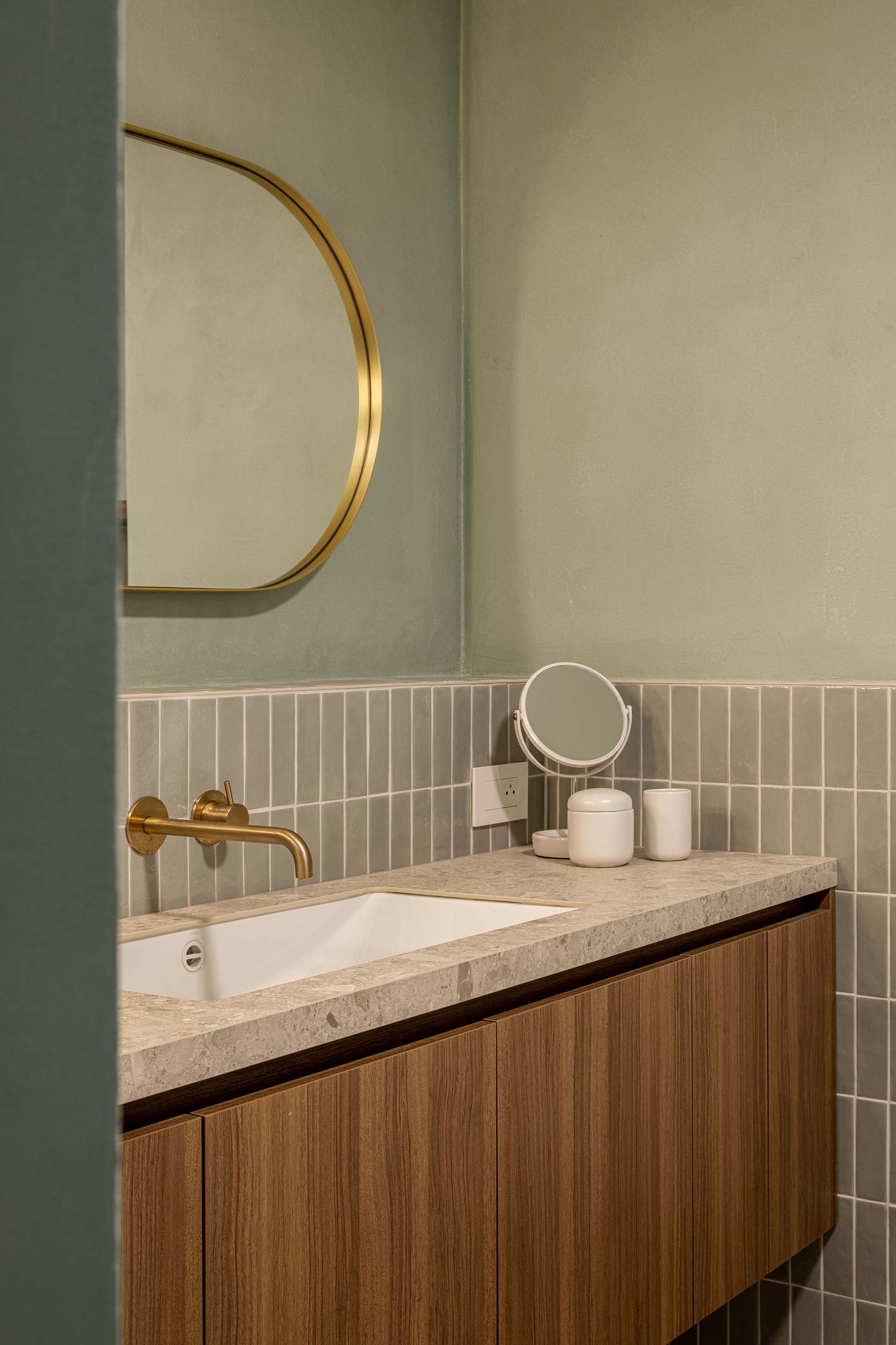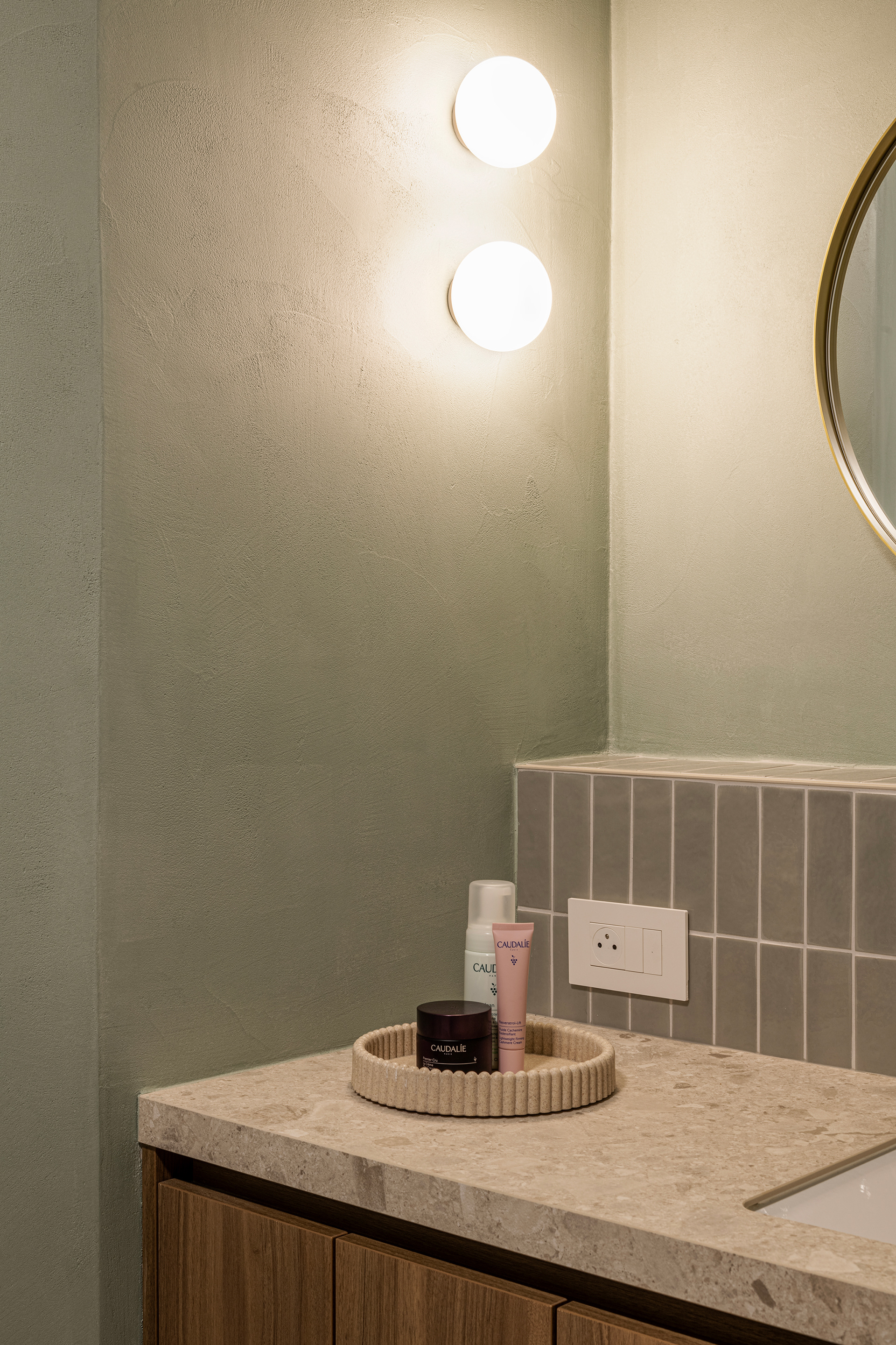 Door te kiezen voor een beperkt aantal warme en tactiele materialen, krijgt het geheel een natuurlijk en rustgevend karakter. Op de wanden werd met een decoratieve schildertechniek kleistuc geplaatst. Doorheen de leefruimtes loopt een eiken visgraatparket. In de keuken en natte ruimtes koos ik voor een keramische tegel met ceppo di gre look. Dit komt ook terug in het opgedikte blad van het haardmeubel en de wastafels in gastentoilet en douchekamer. Voor het maatwerk koos ik een kwaliteitsvolle laminaat met notelaar decor. De master badkamer zorgt voor een kleurrijk accent met salie-kleurig kleistuc en bijpassende wandtegeltjes.