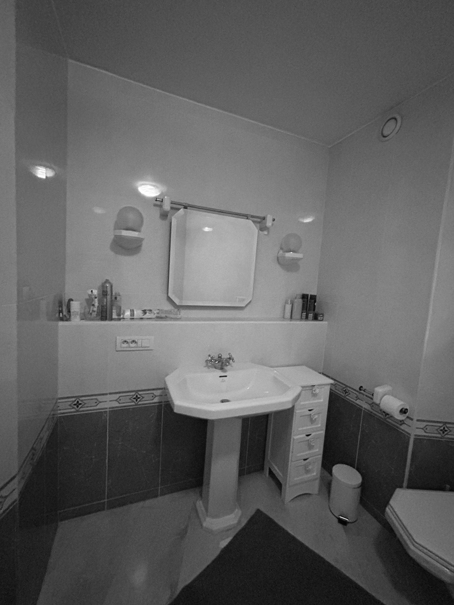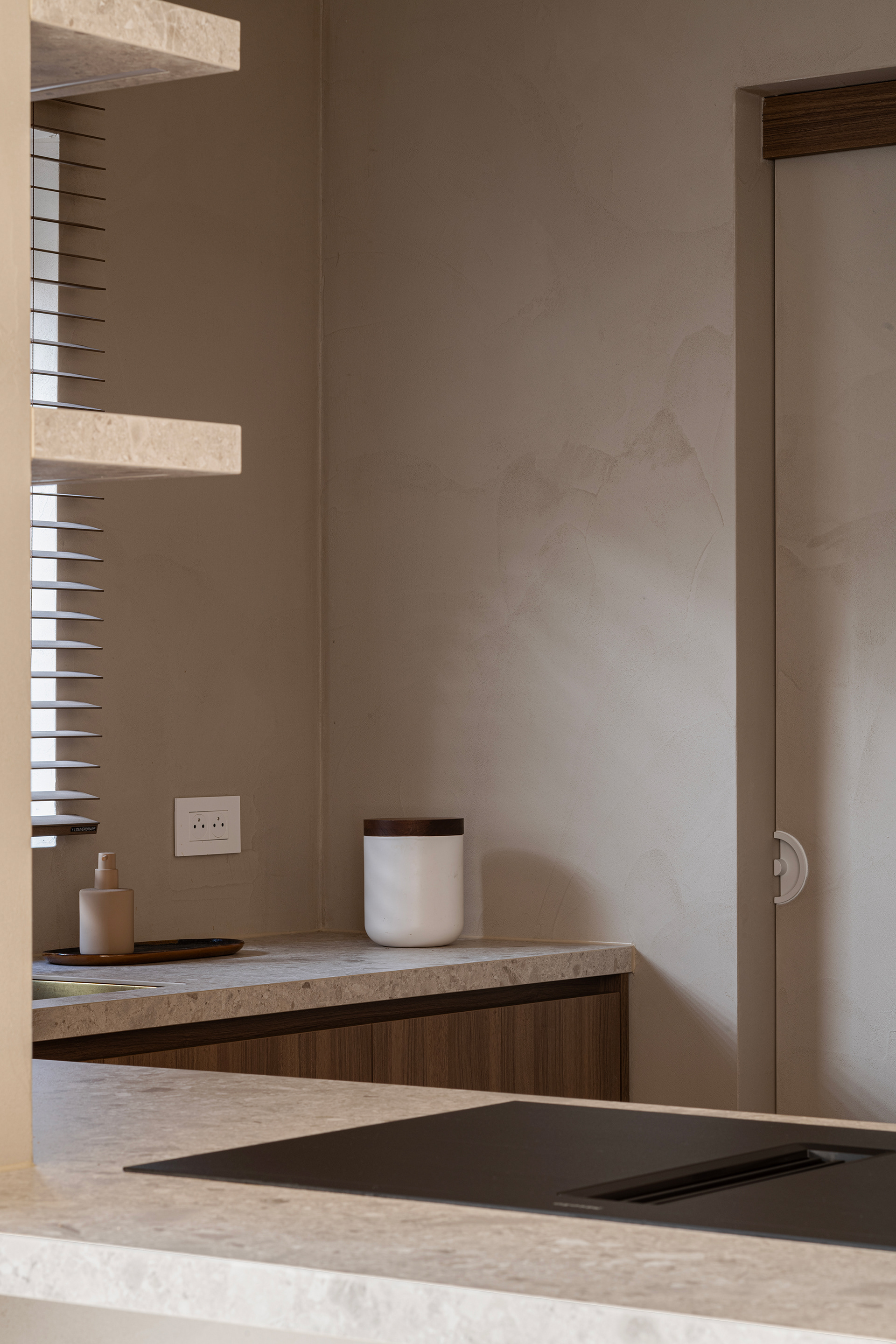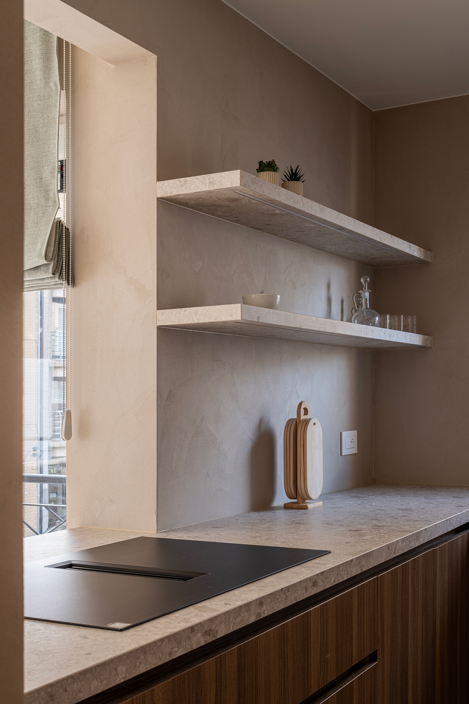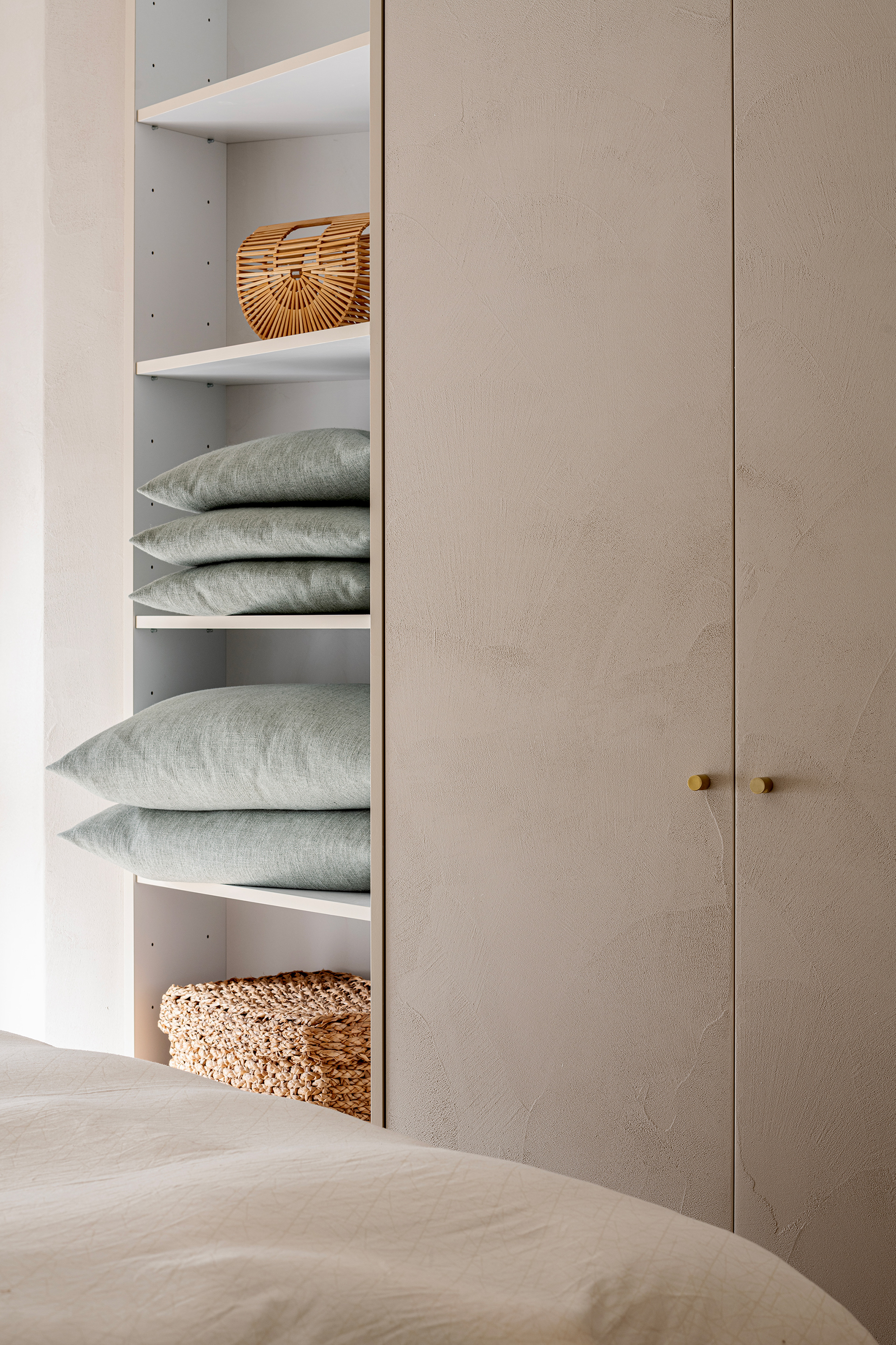 Door te kiezen voor een beperkt aantal warme en tactiele materialen, krijgt het geheel een natuurlijk en rustgevend karakter. Op de wanden werd met een decoratieve schildertechniek kleistuc geplaatst. Doorheen de leefruimtes loopt een eiken visgraatparket. In de keuken en natte ruimtes koos ik voor een keramische tegel met ceppo di gre look. Dit komt ook terug in het opgedikte blad van het haardmeubel en de wastafels in gastentoilet en douchekamer. Voor het maatwerk koos ik een kwaliteitsvolle laminaat met notelaar decor. De master badkamer zorgt voor een kleurrijk accent met salie-kleurig kleistuc en bijpassende wandtegeltjes.
