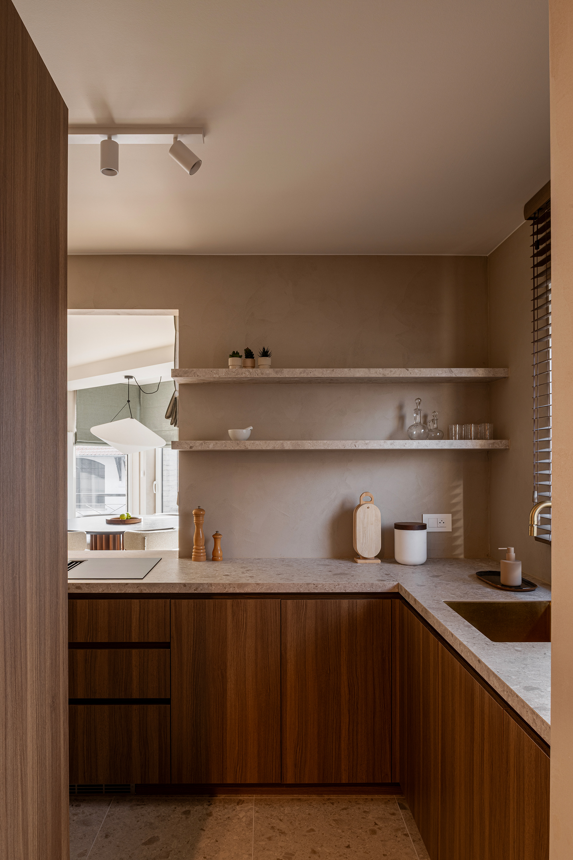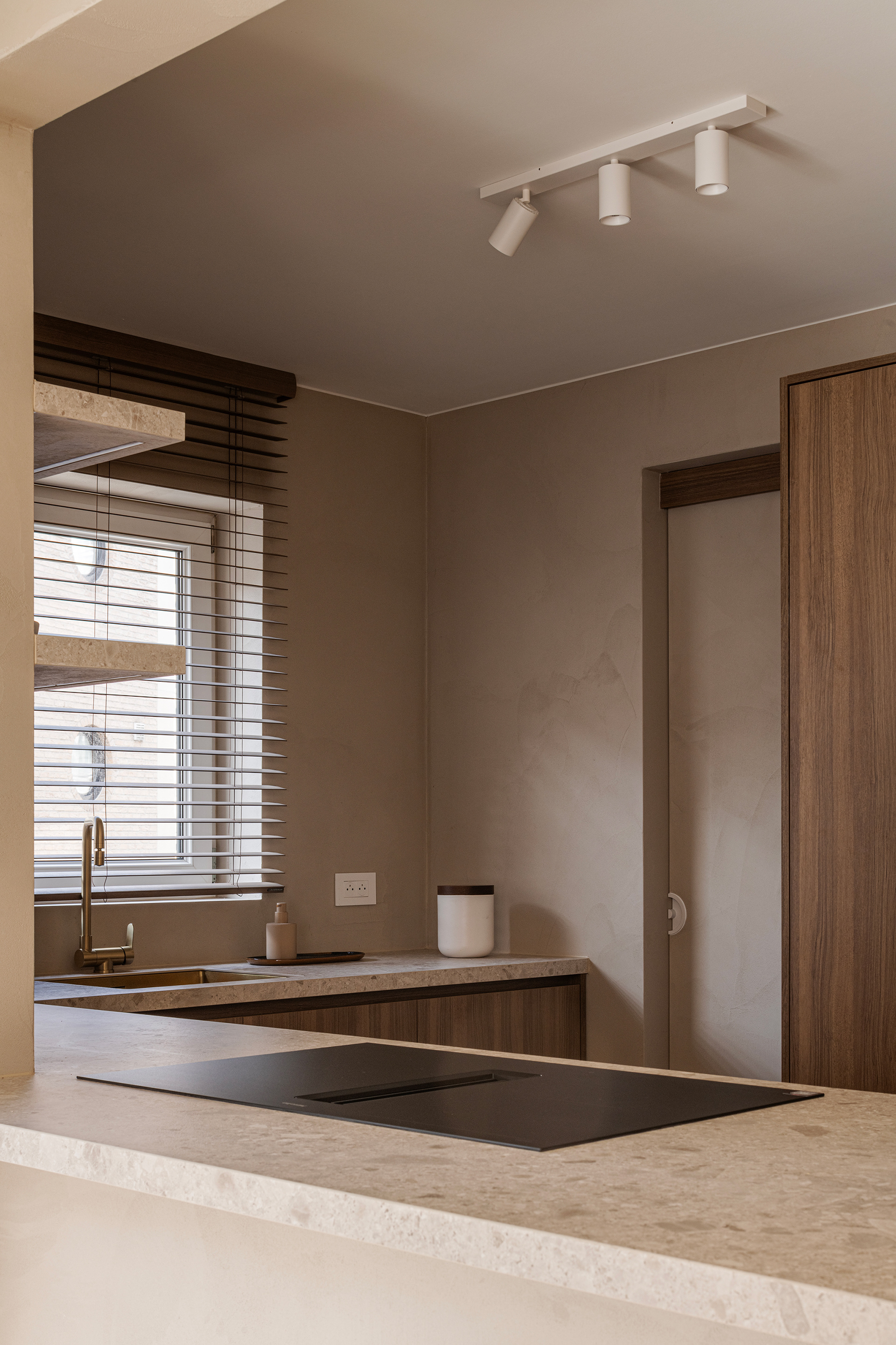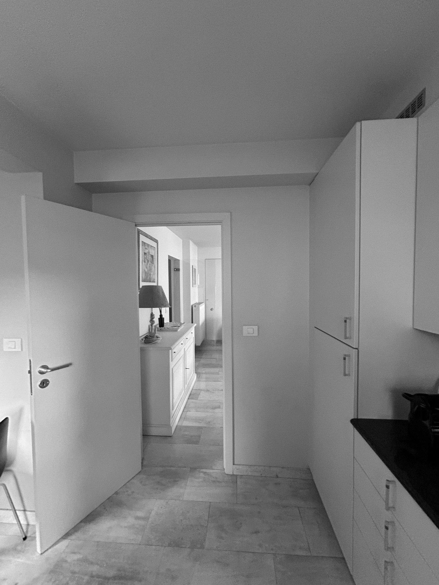 Centraal in het ontwerp staat de keuken. De bouwheer wou vooral meer openheid en contact met de leefruimte. Hiervoor maakte ik een ontwerp dat zowel rekening hield met zijn wensen als enkele technische belemmeringen, zoals een vrij omvangrijke technische schacht en een ventilatiekoker die langs het plafond loopt. Door de wanden naast de technische schacht te openen en de deur te supprimeren creëerde ik meer openheid en doorzicht. Door middel van een kastenwand werd er een visuele scheiding gecreëerd tussen keuken en berging. Hierdoor wonnen we ook praktische bergruimte en kon de keuken ruimtelijk en visueel meer opengetrokken worden.