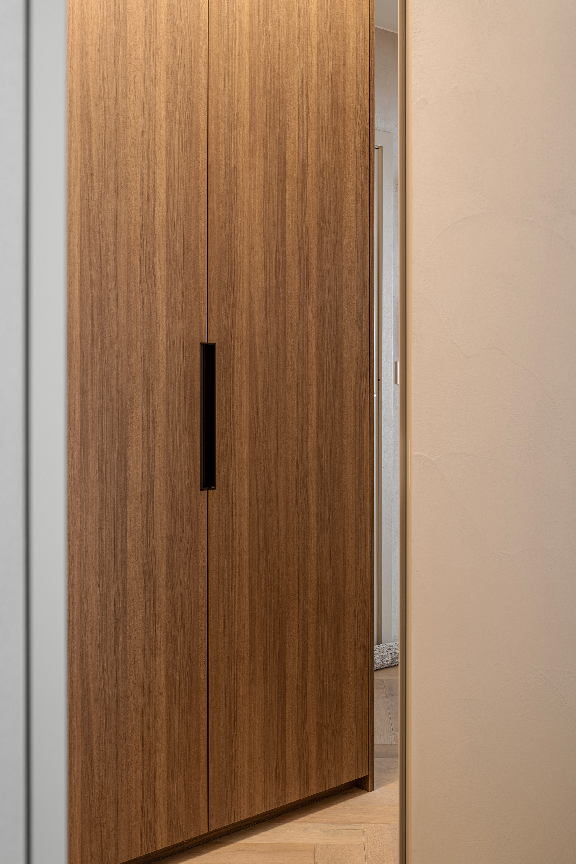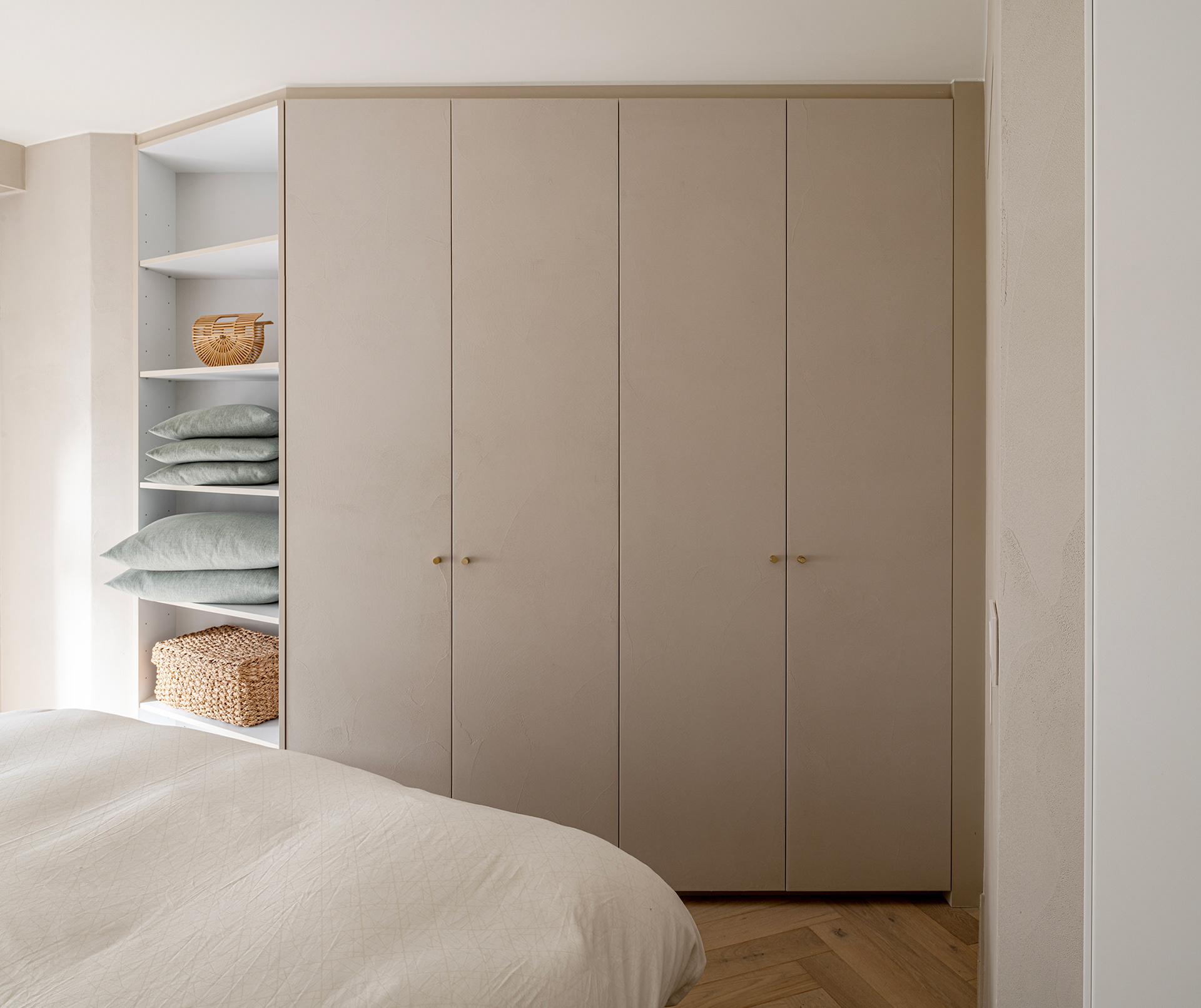 De bouwheer had nood aan meer en vooral praktische bergruimte, en miste in de hal een dressing om jassen en schoenen snel en netjes op te bergen. Om de vrije ruimte in de nachthal te vrijwaren ontwierp ik een ondiepe, ingewerkte kast over de volledige lengte van de hal. Omwille van de beperkte diepte werkten we met uitschuifbare kledingstangen. De kast werd uitgevoerd in kwaliteitsvol laminaat en melamine met notelaar decor.