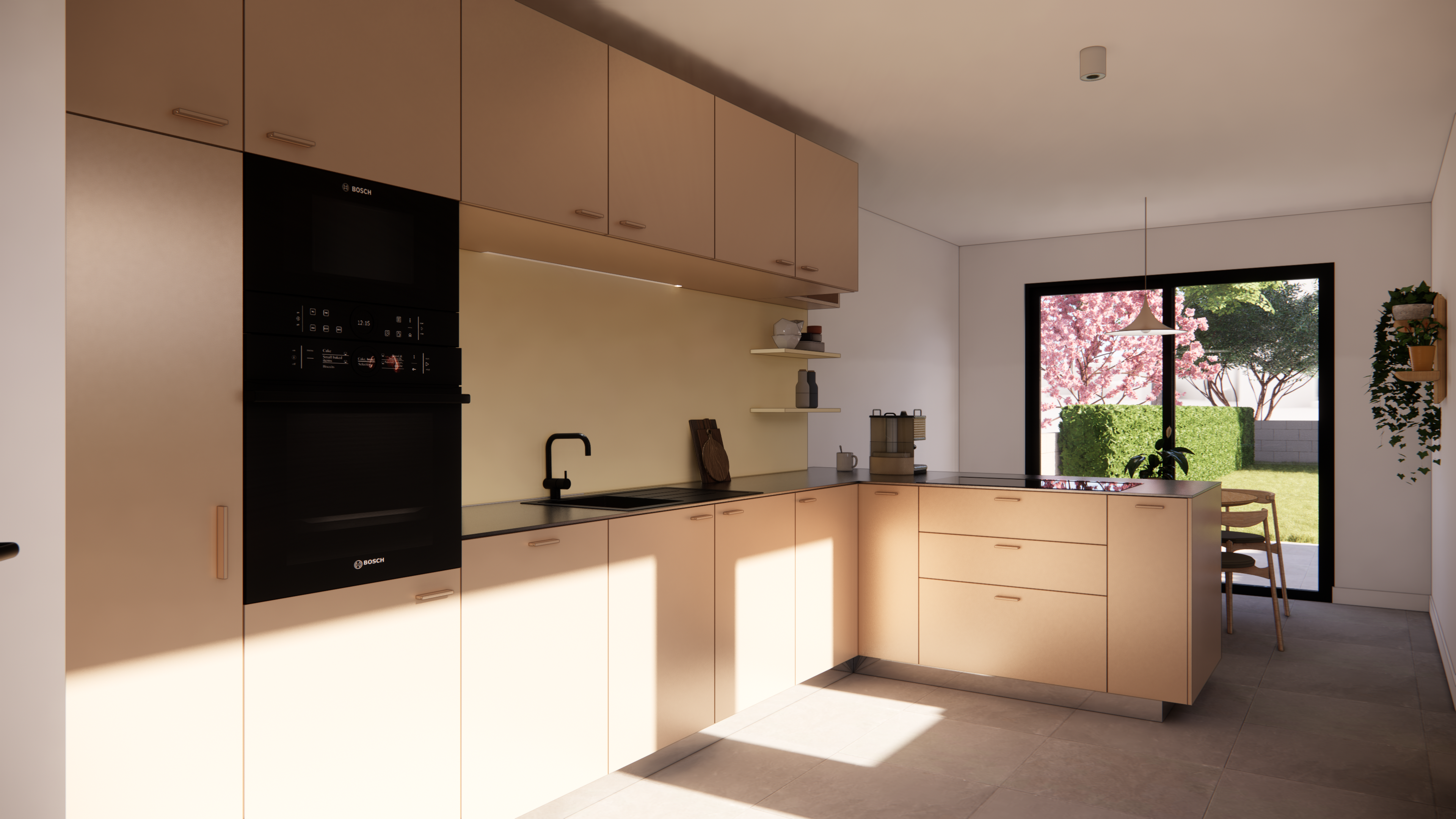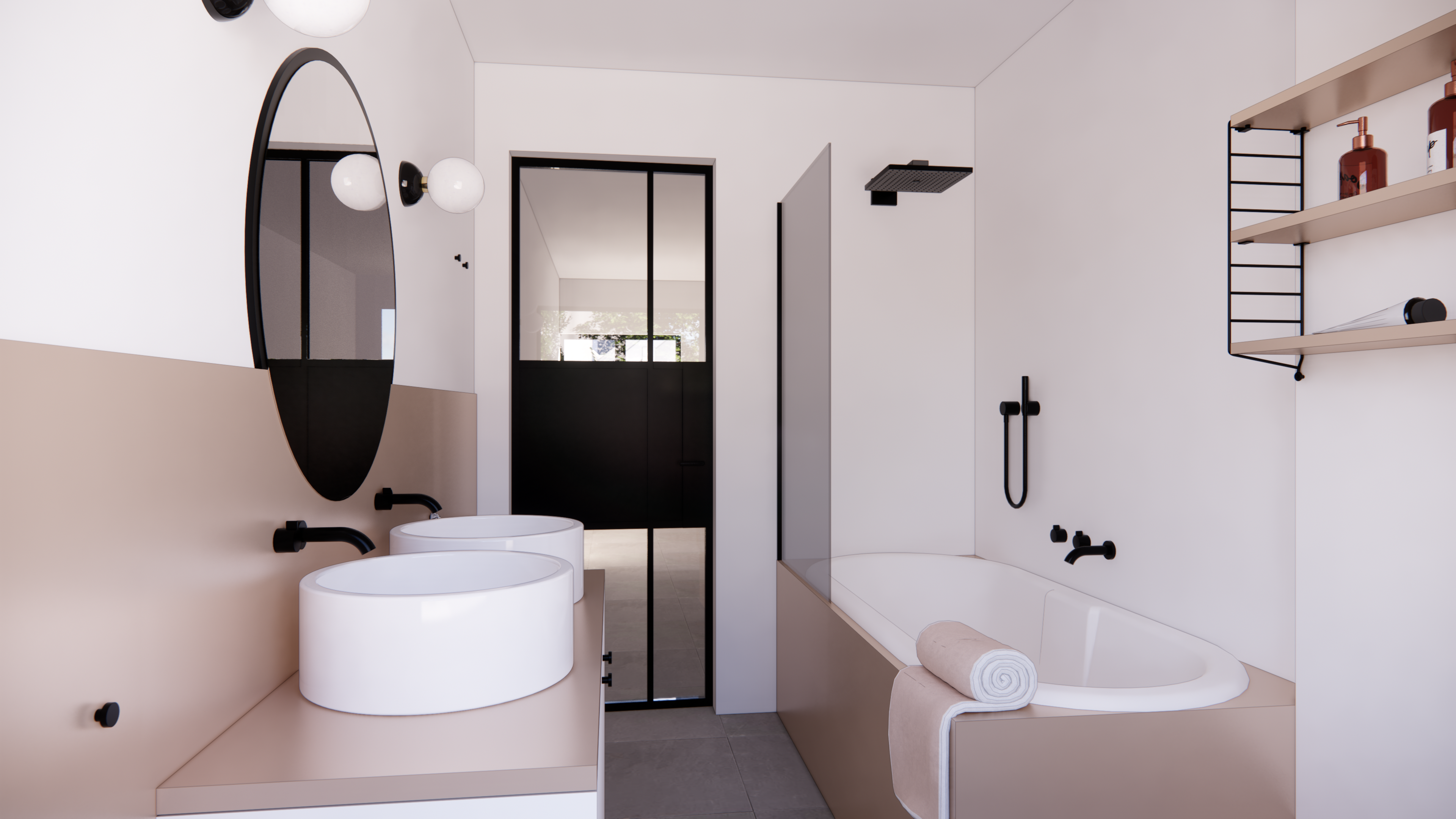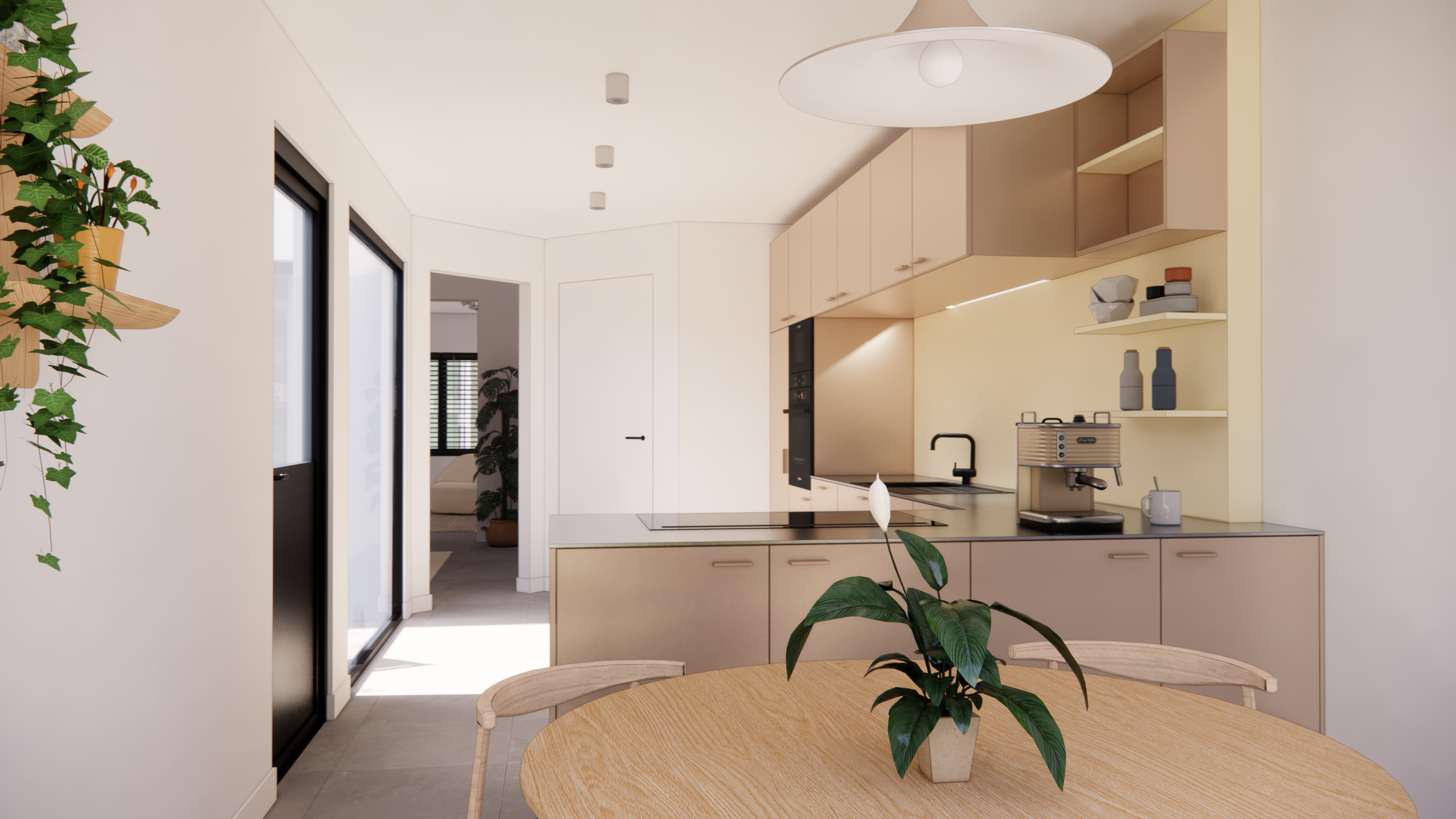 Ontwerp voor een leefkeuken en compacte badkamer. Gezinswoning te koop in D.