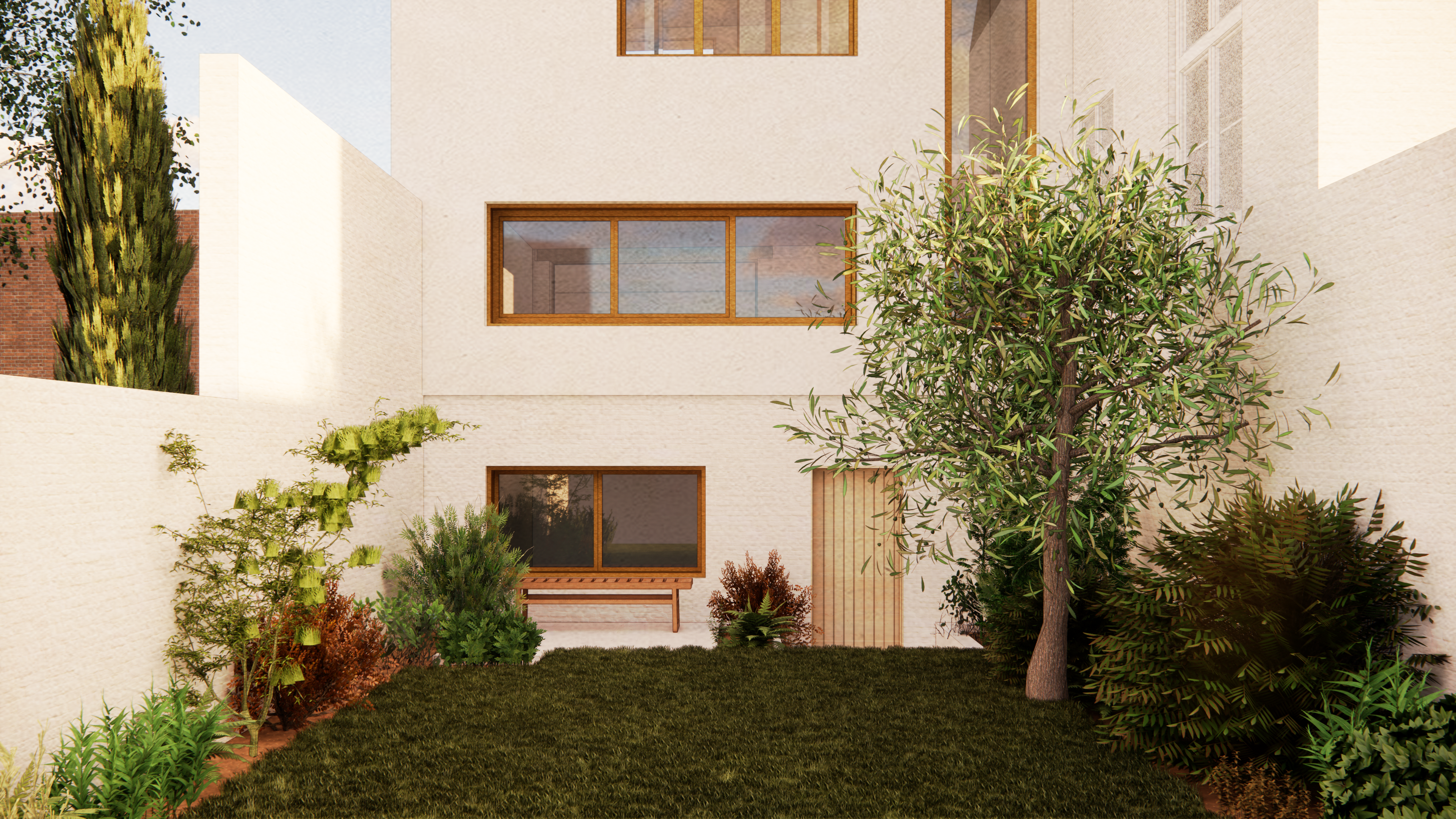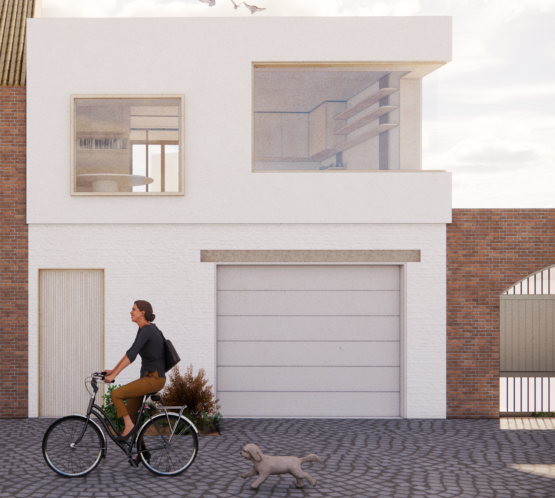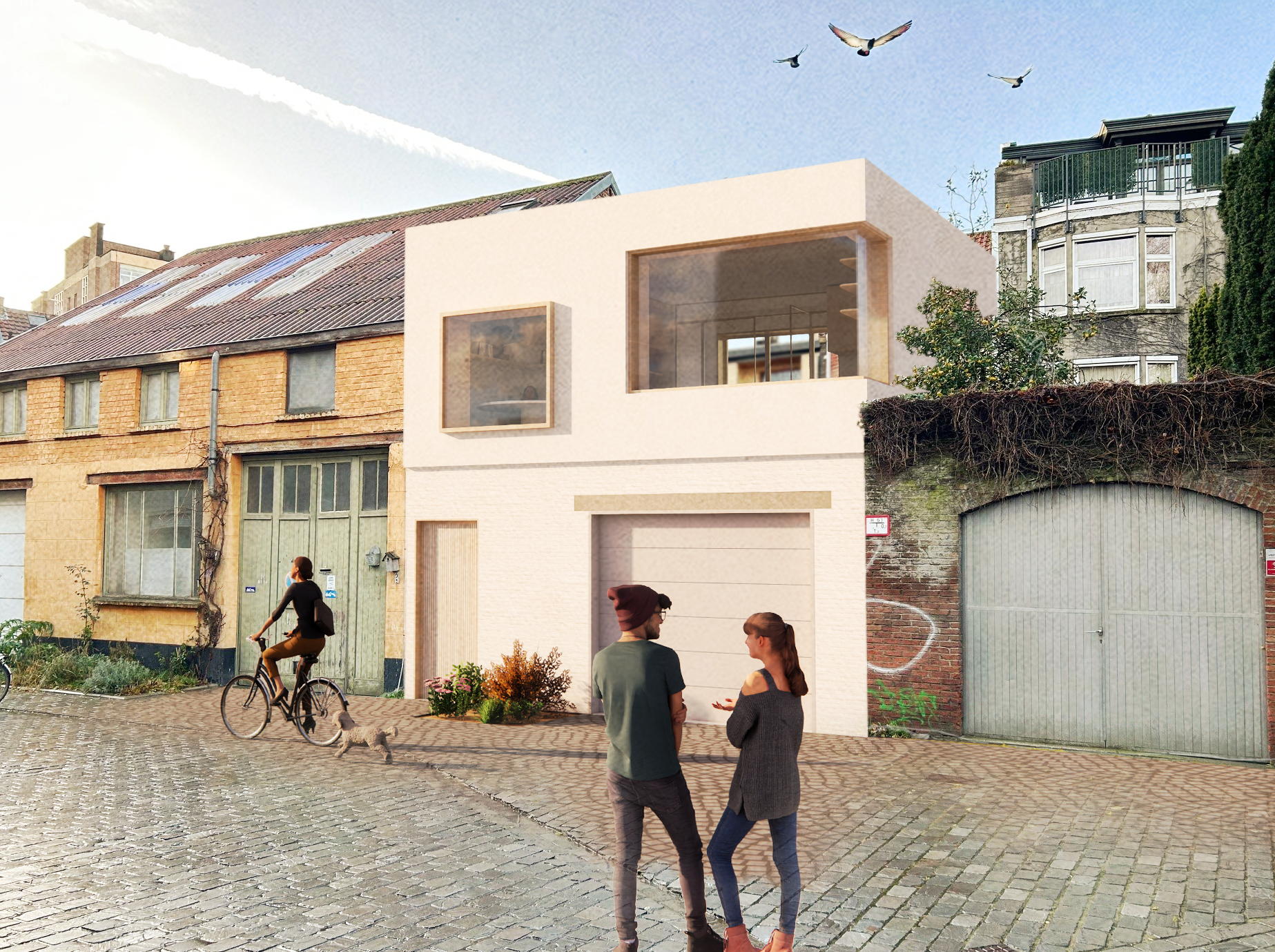 Ontwerp voor renovatie van een bijgebouw tot bureauruimte met inkom, garage en bergplaats.