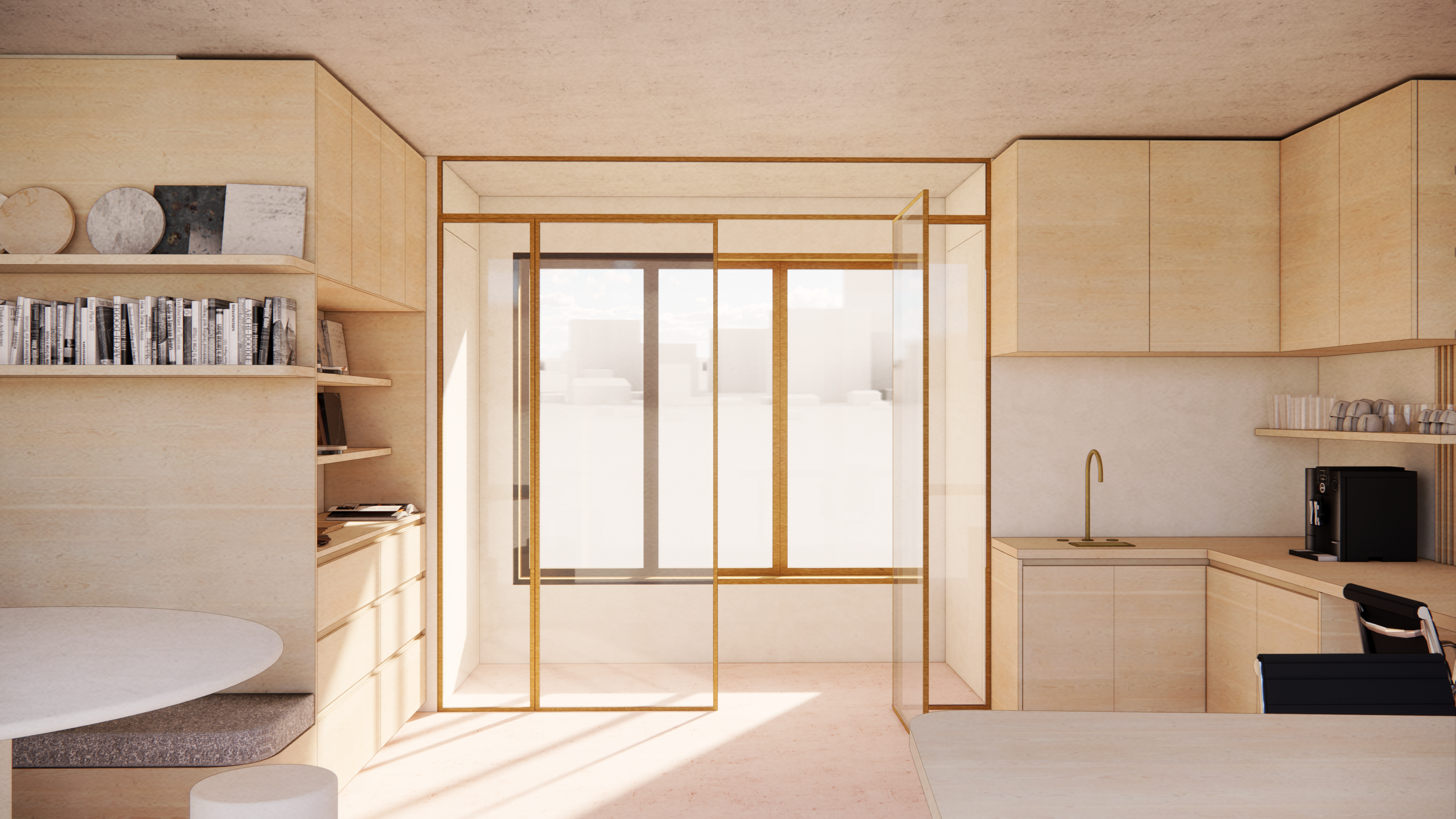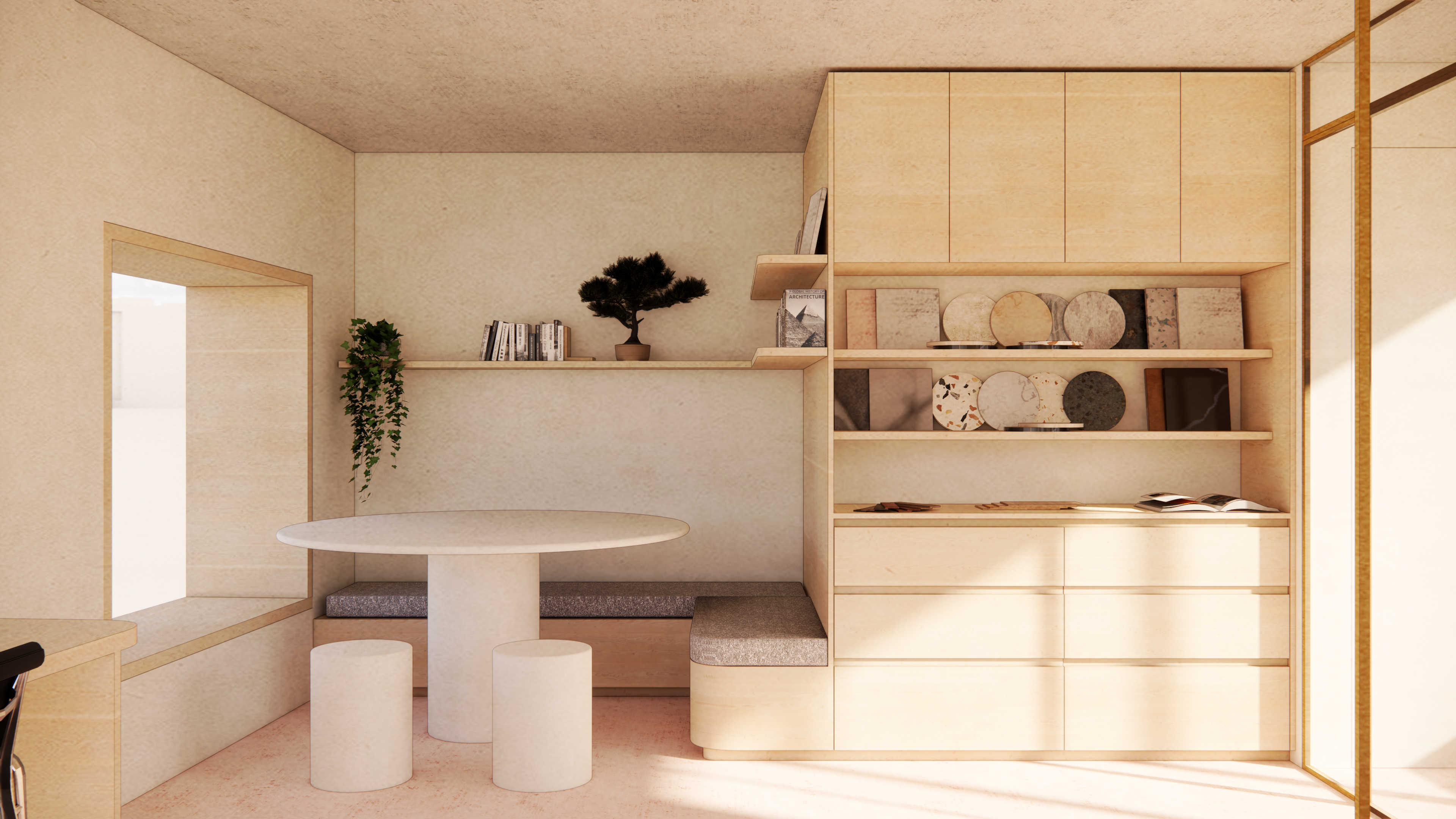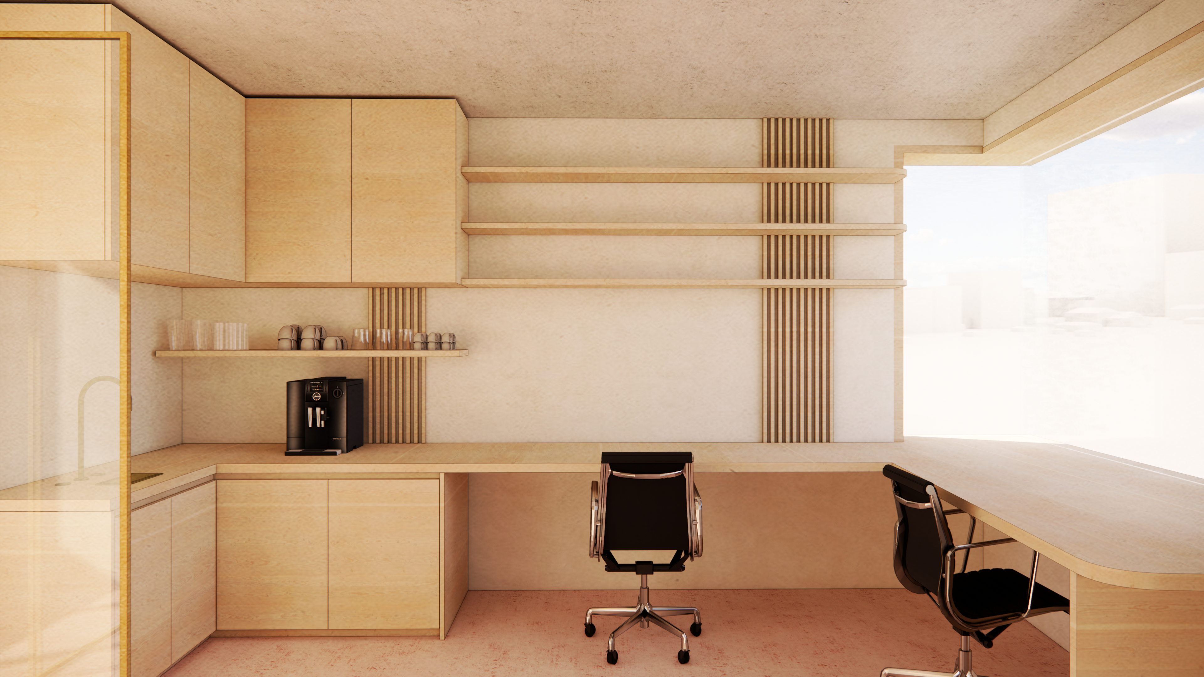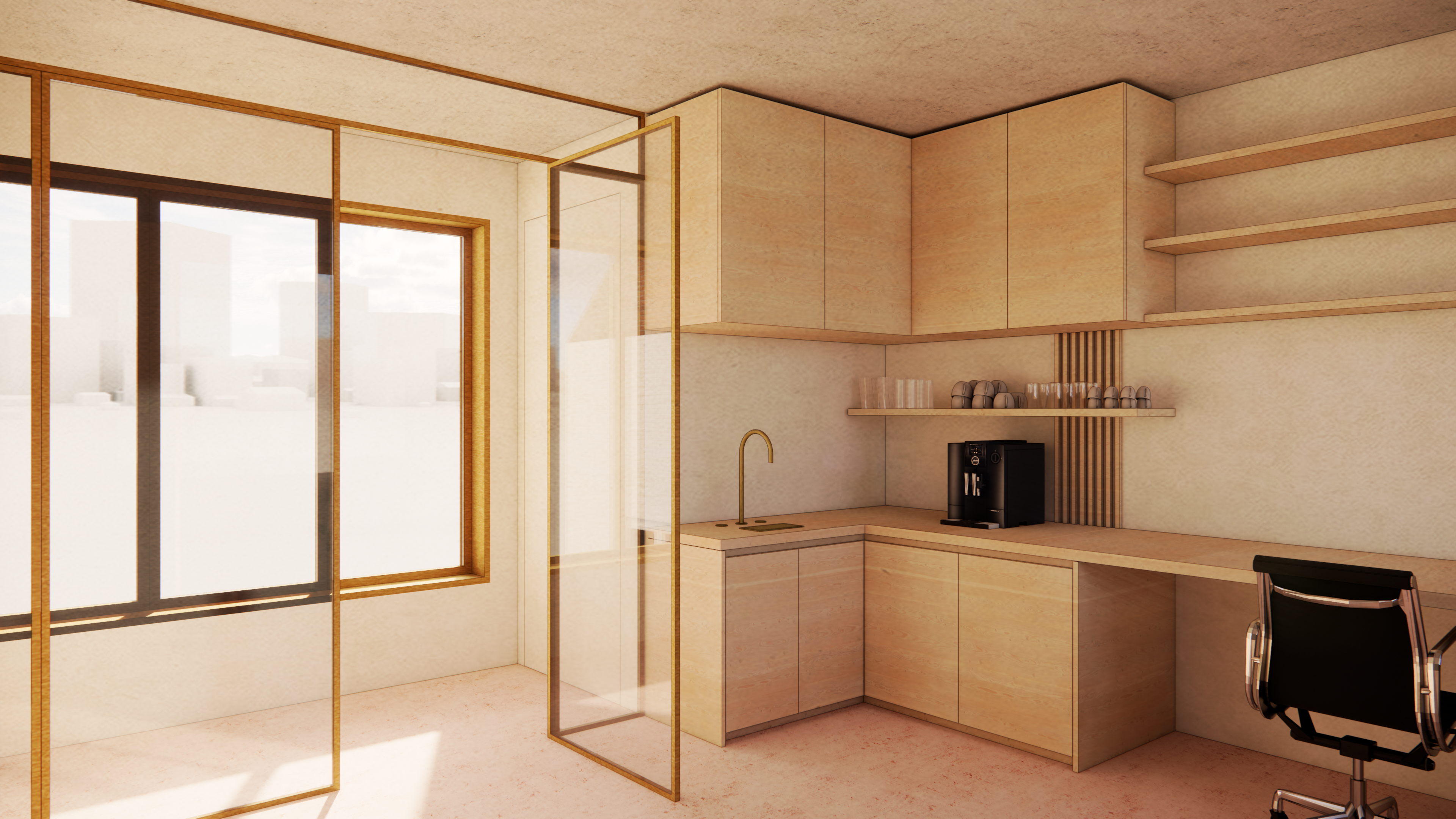 Ontwerp voor renovatie van een bijgebouw tot bureauruimte met inkom, garage en bergplaats.