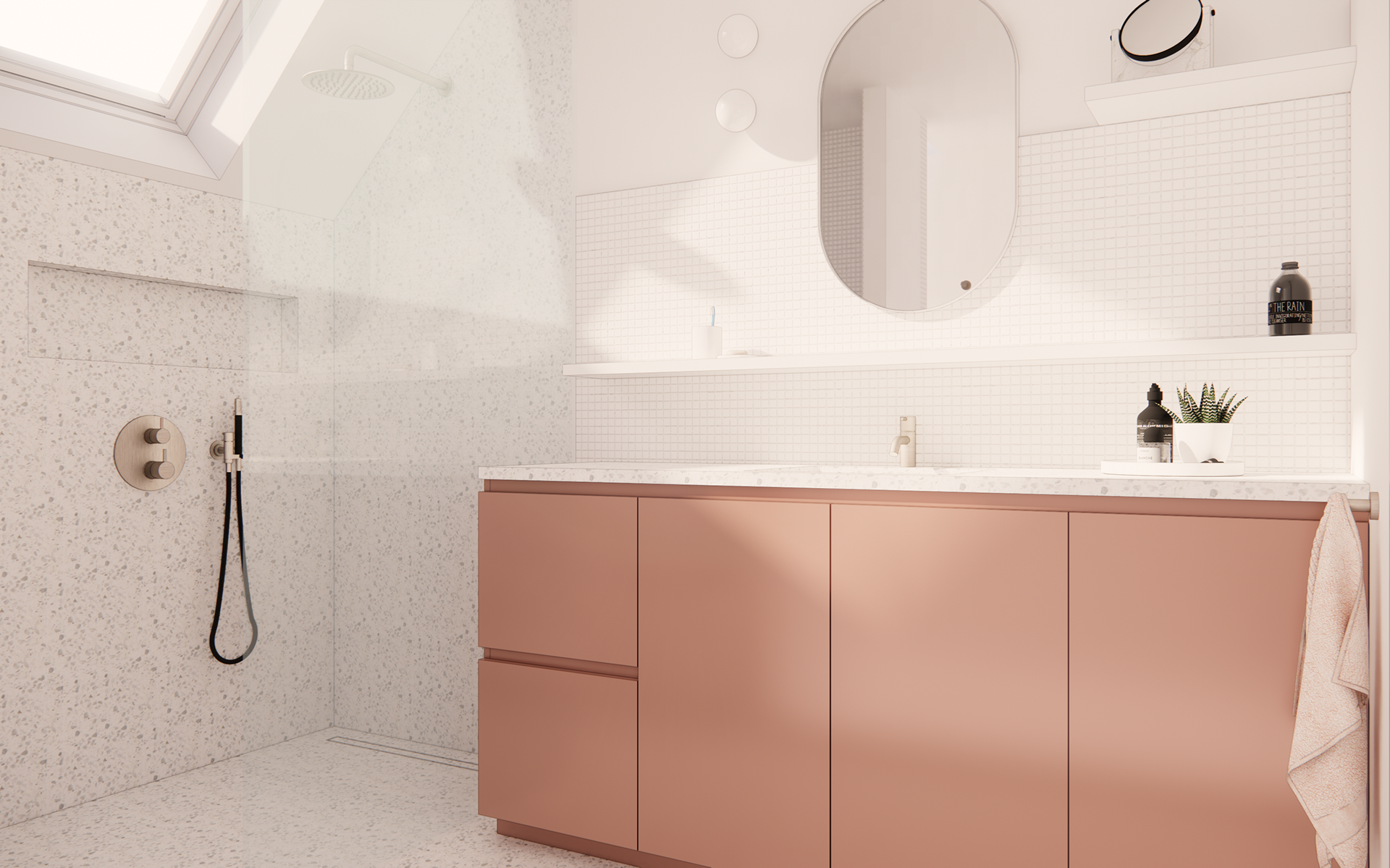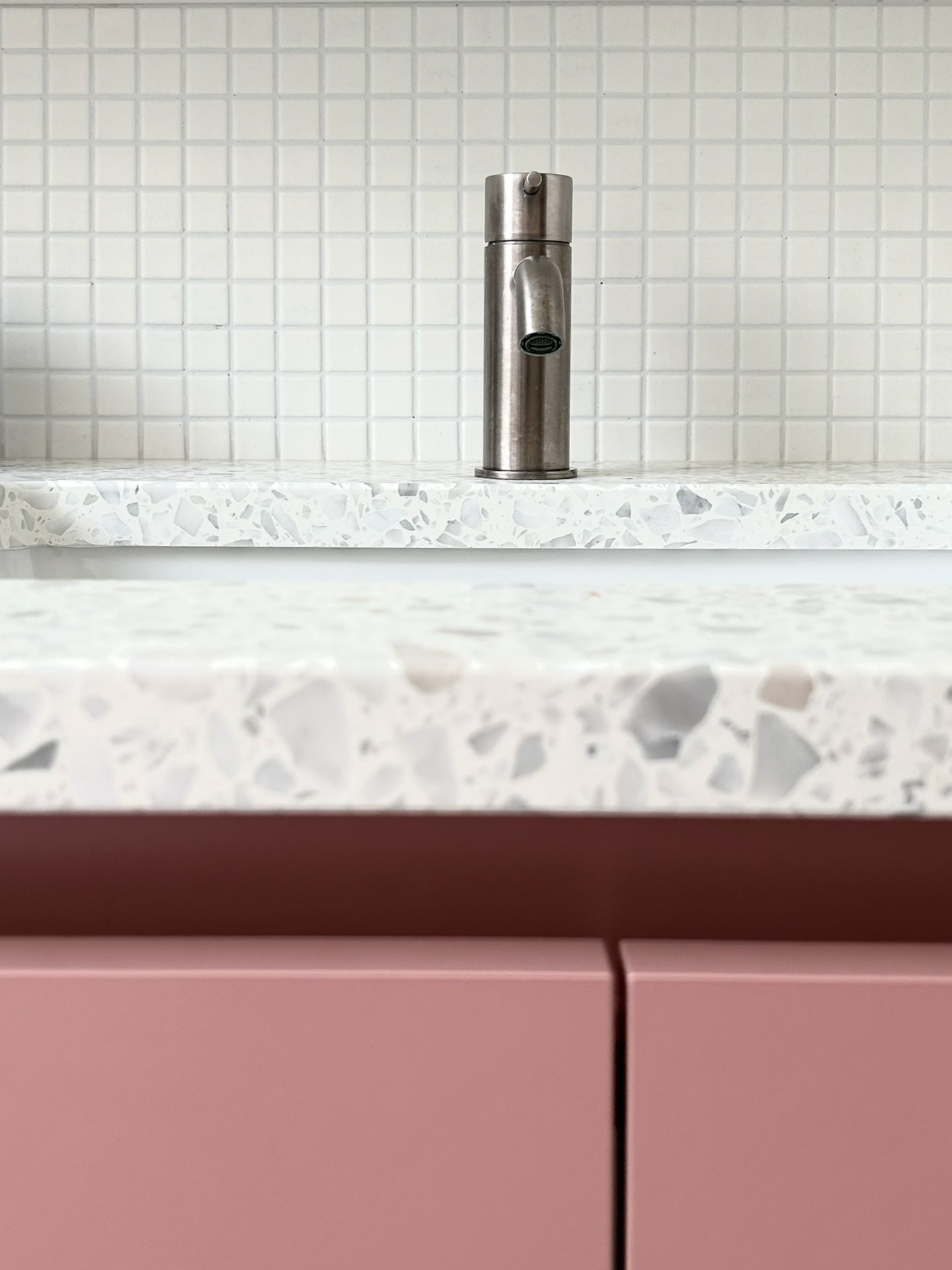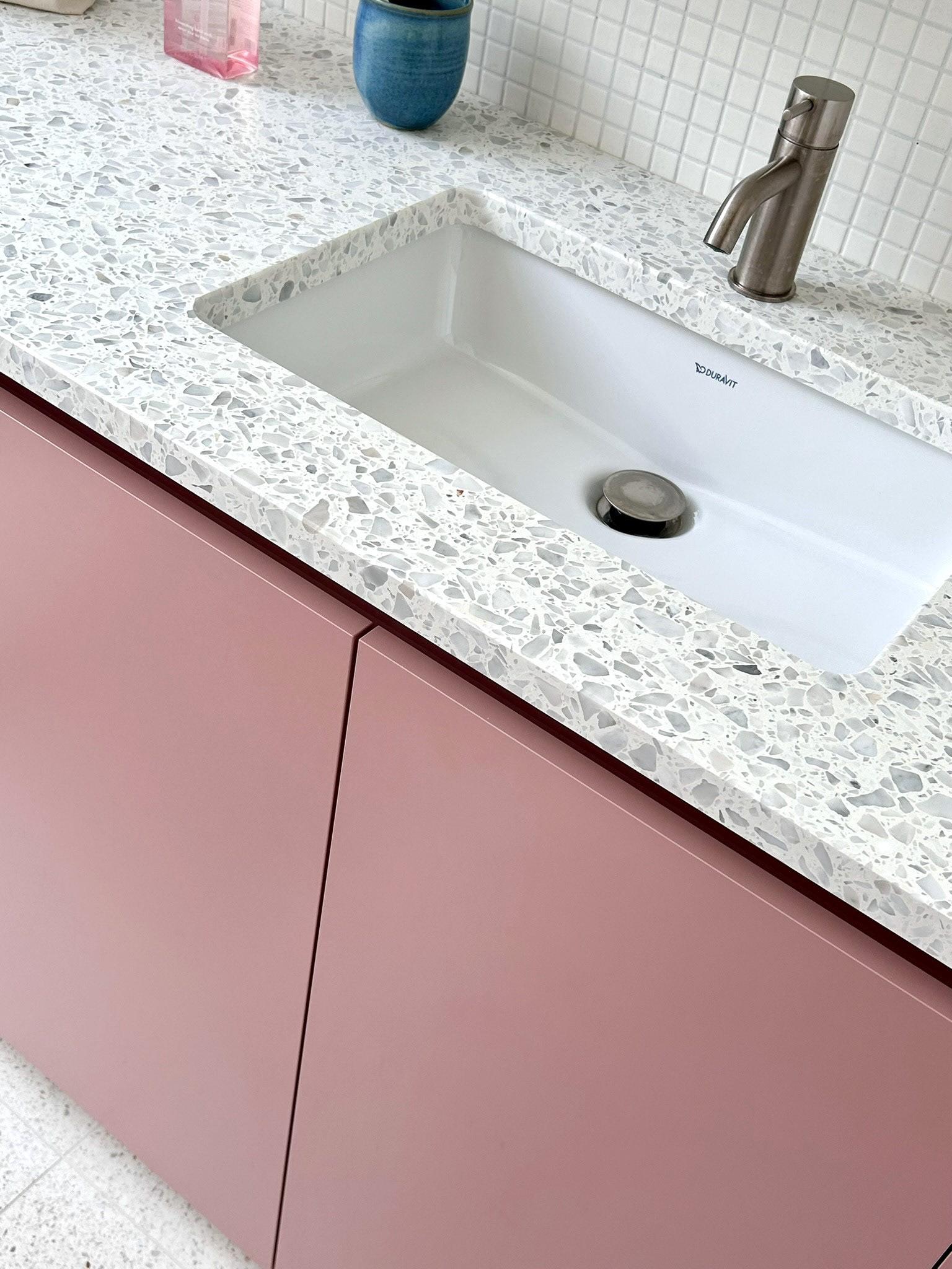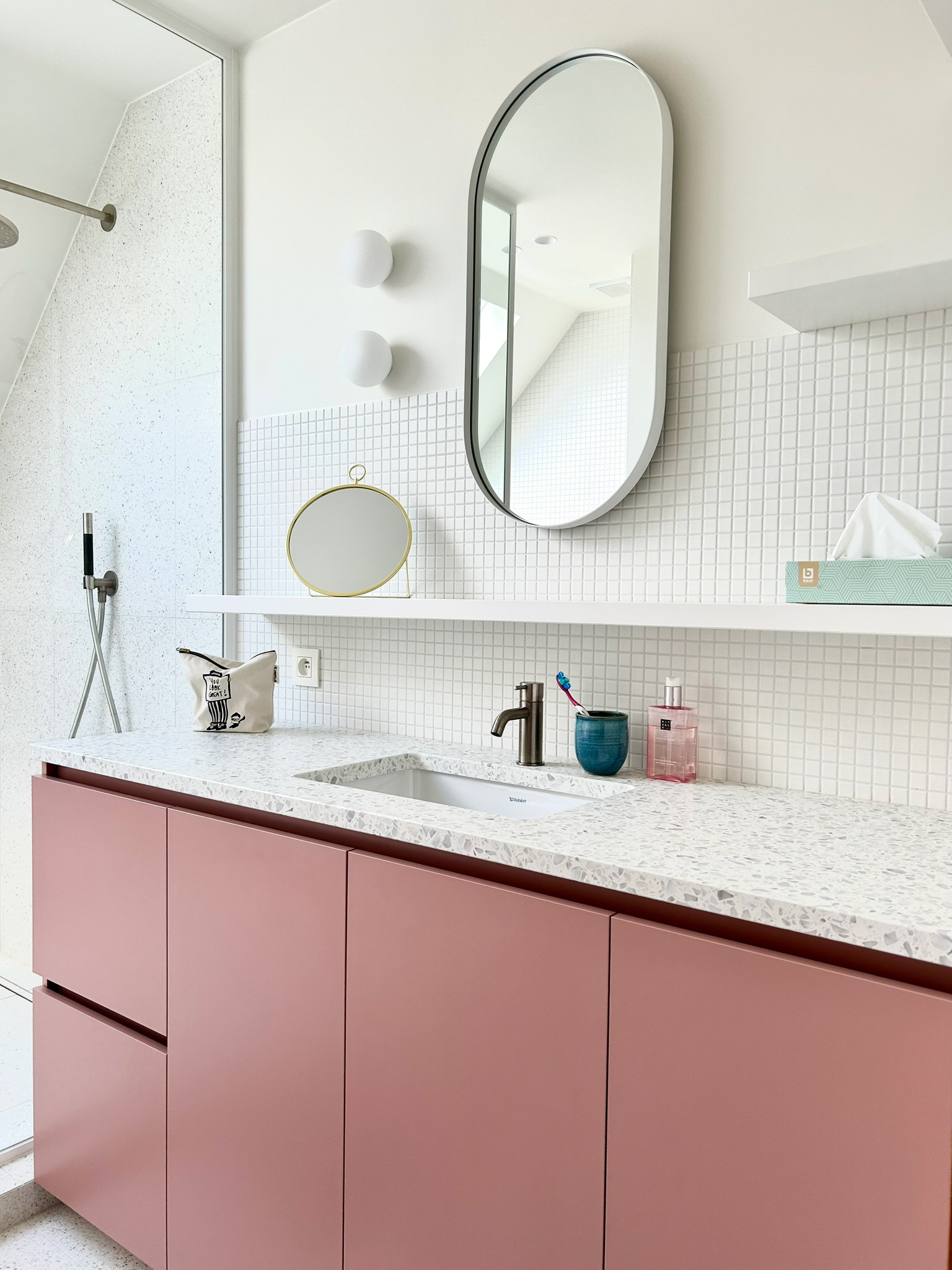 Frisse badkamer voor de kinderen met laminaat in 'blush' tint, terrazzo en keramische tegels.