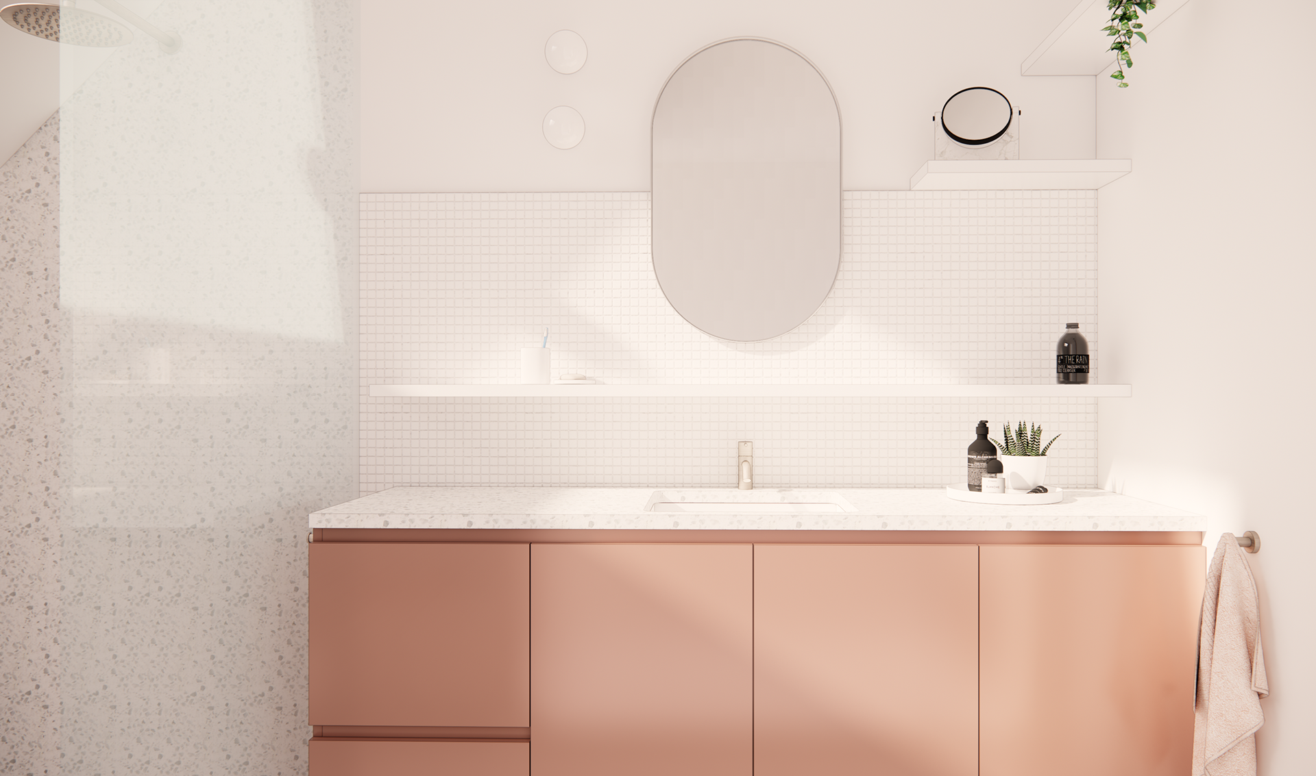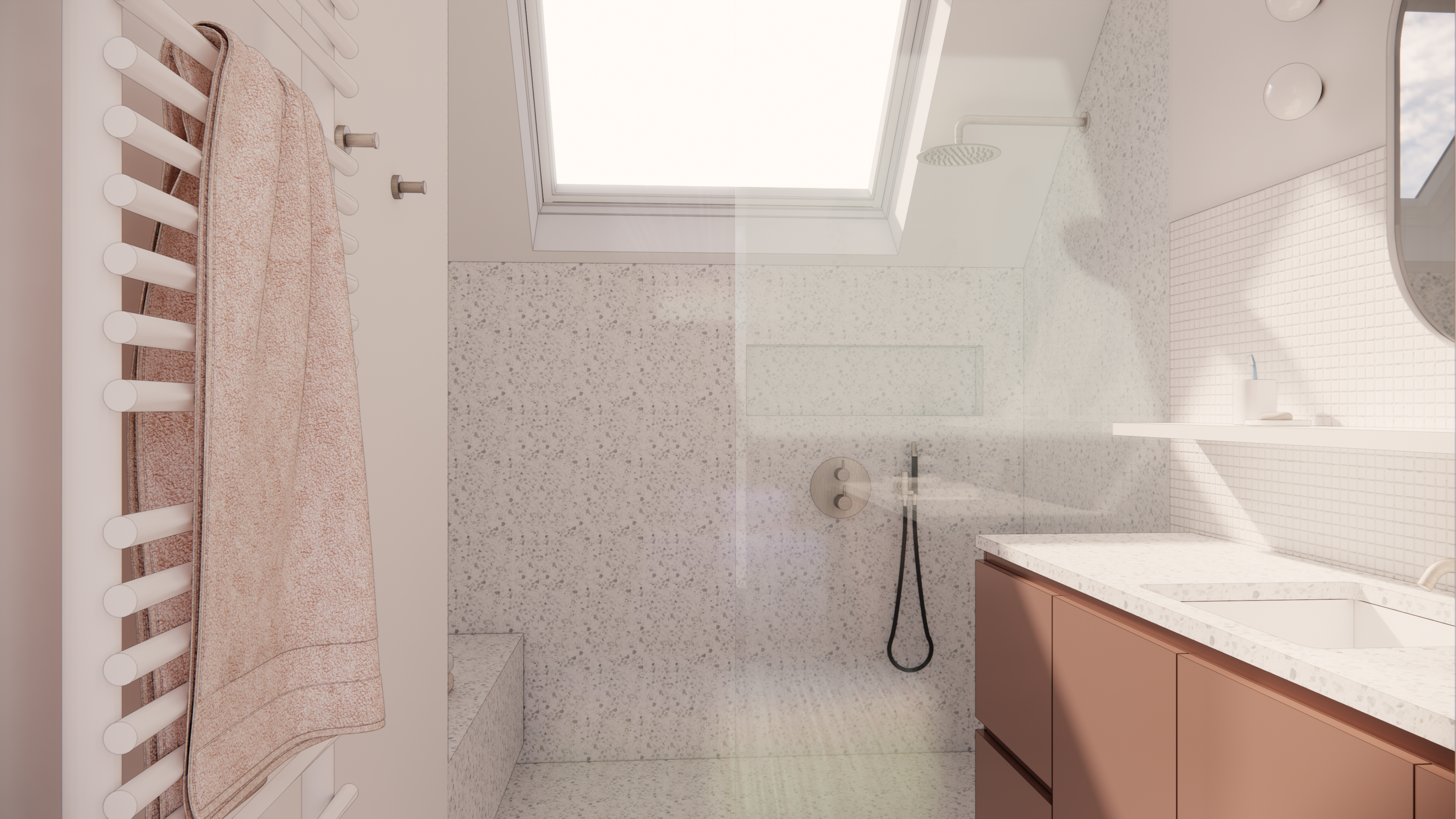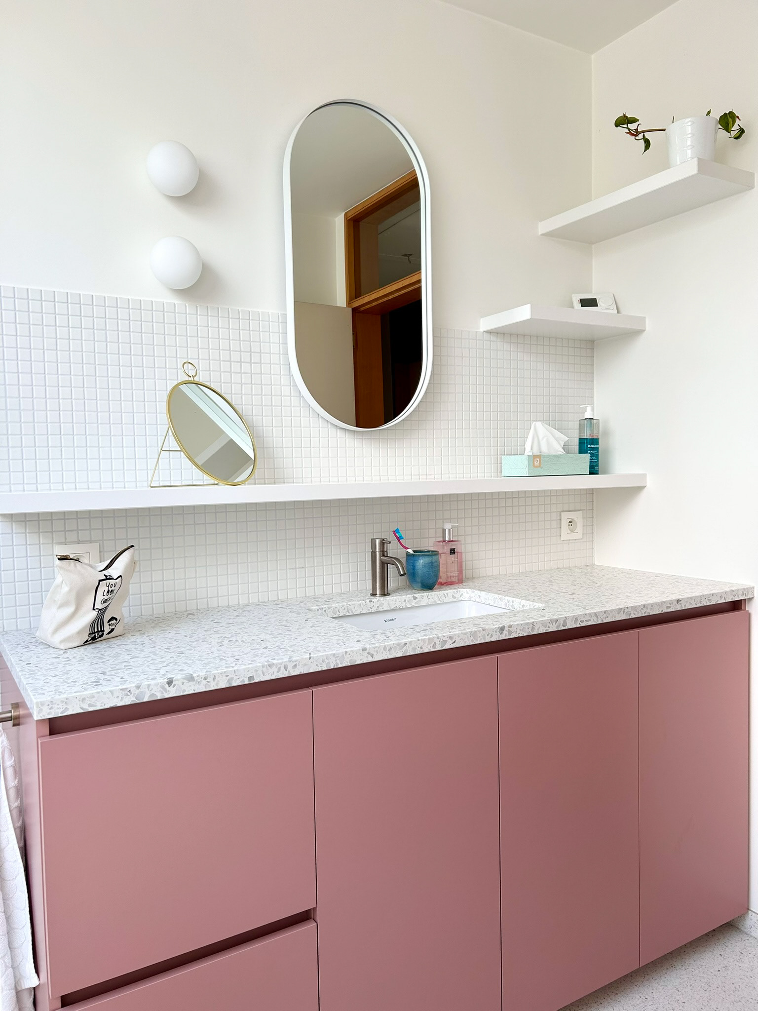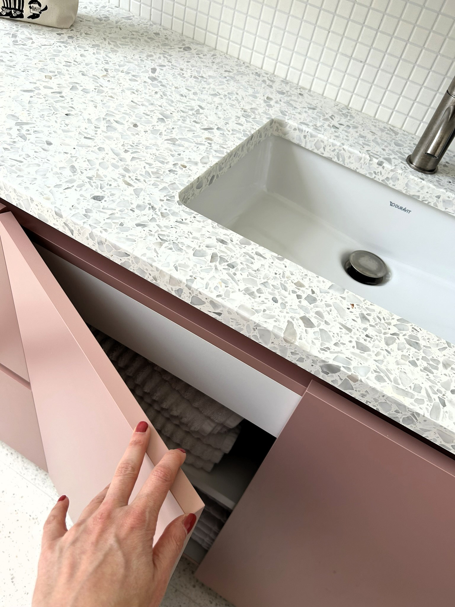 Frisse badkamer voor de kinderen met laminaat in 'blush' tint, terrazzo en keramische tegels.