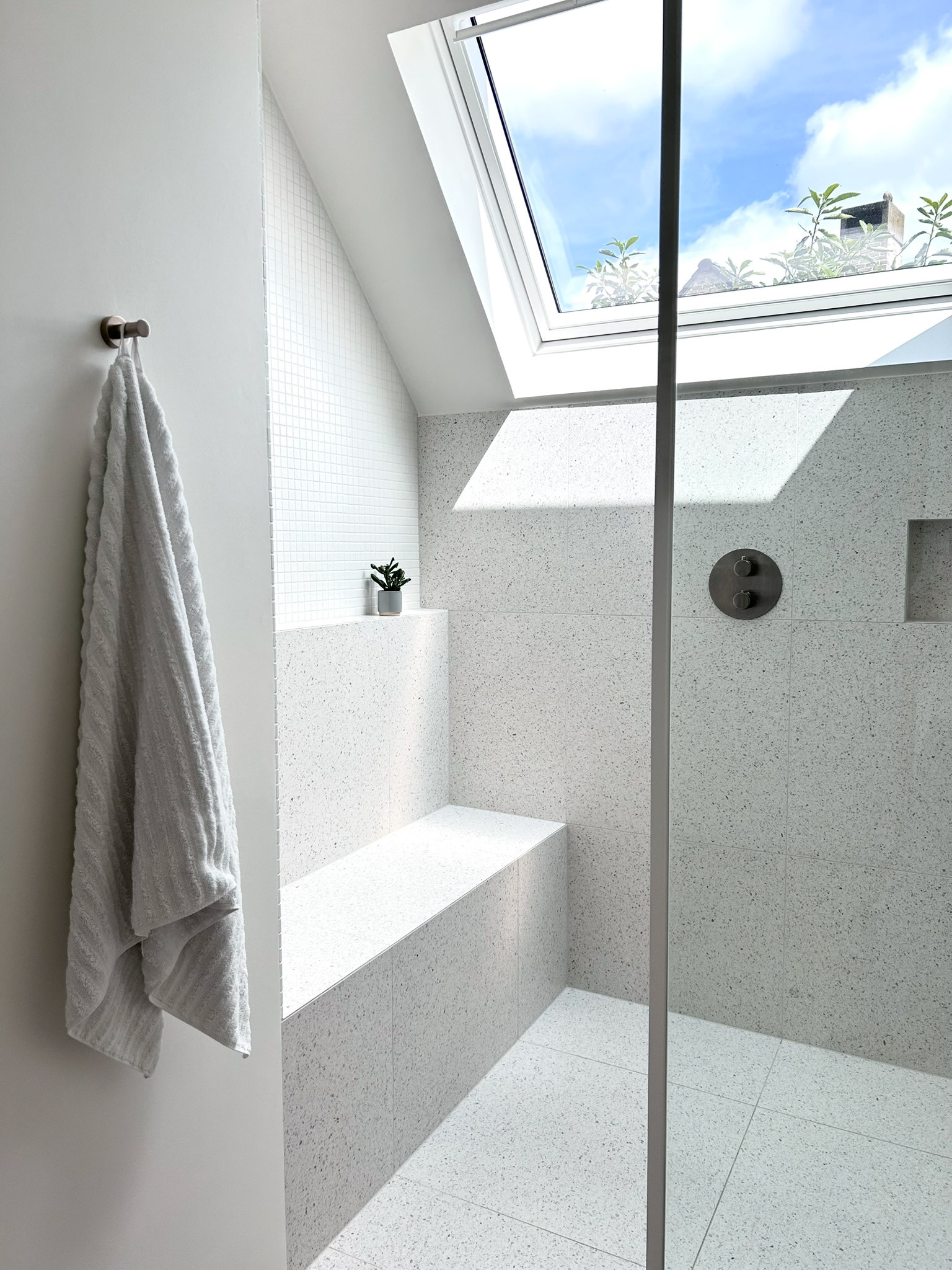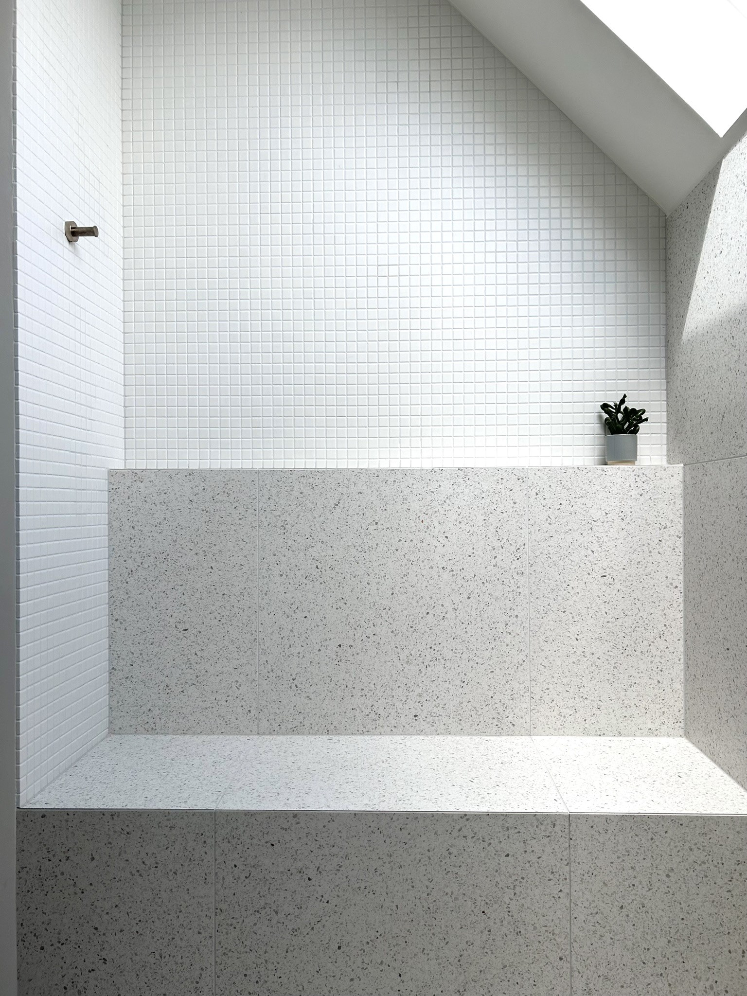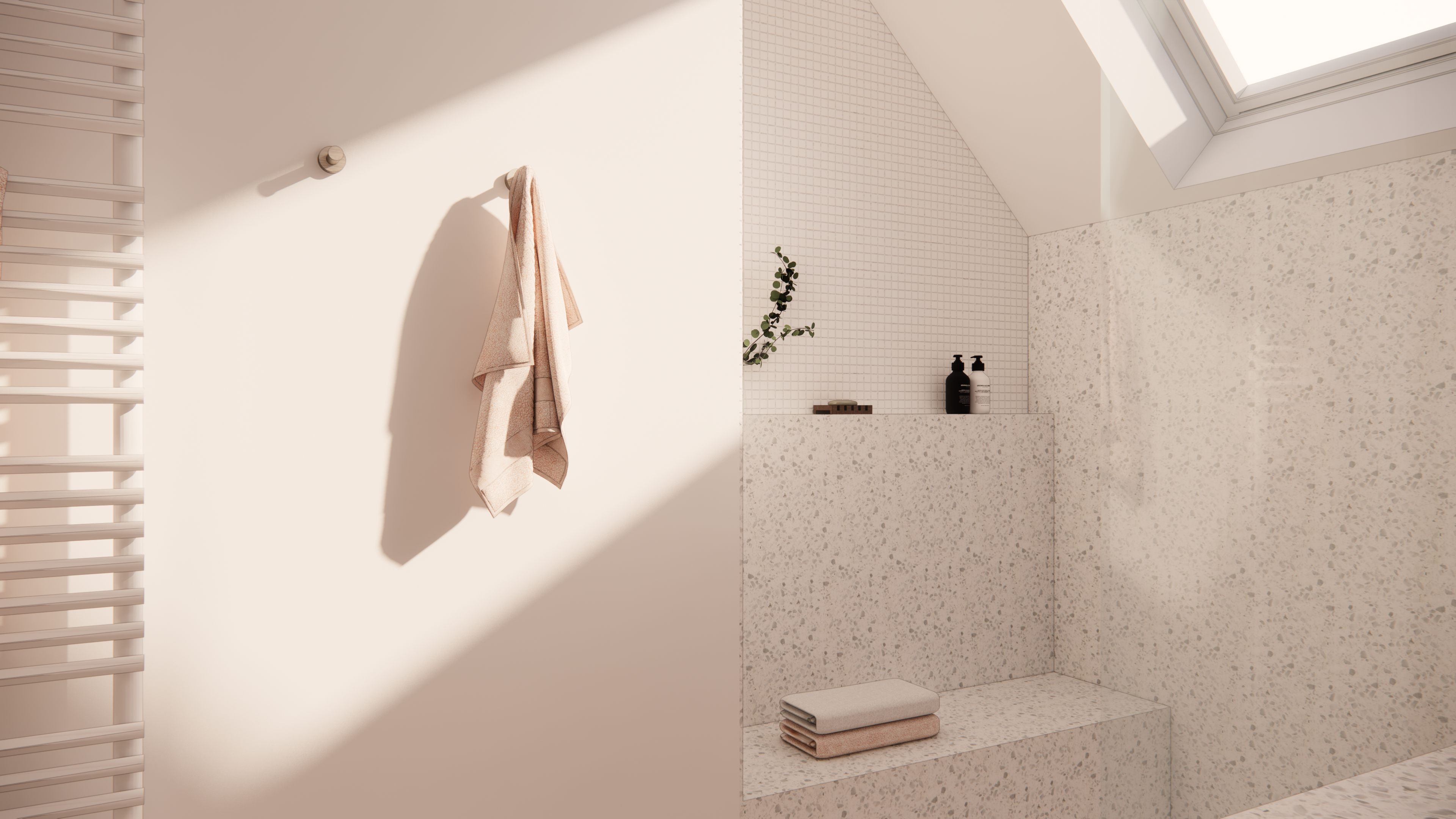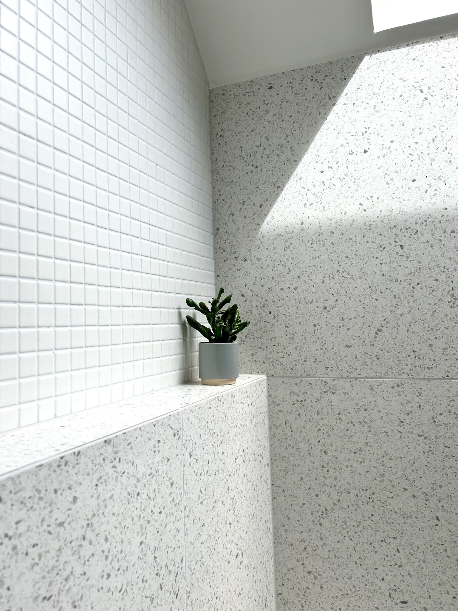 Frisse badkamer voor de kinderen met laminaat in 'blush' tint, terrazzo en keramische tegels.