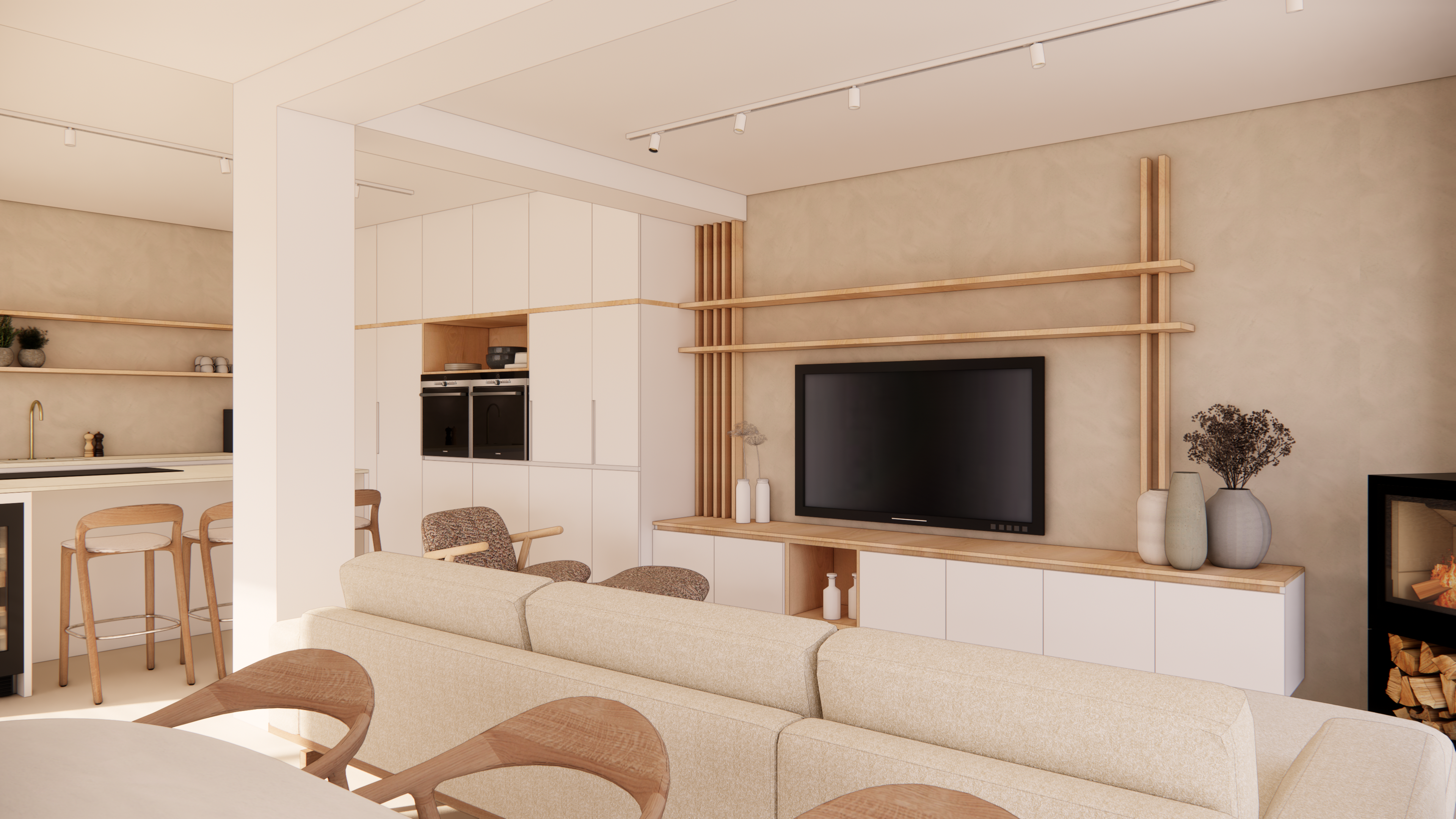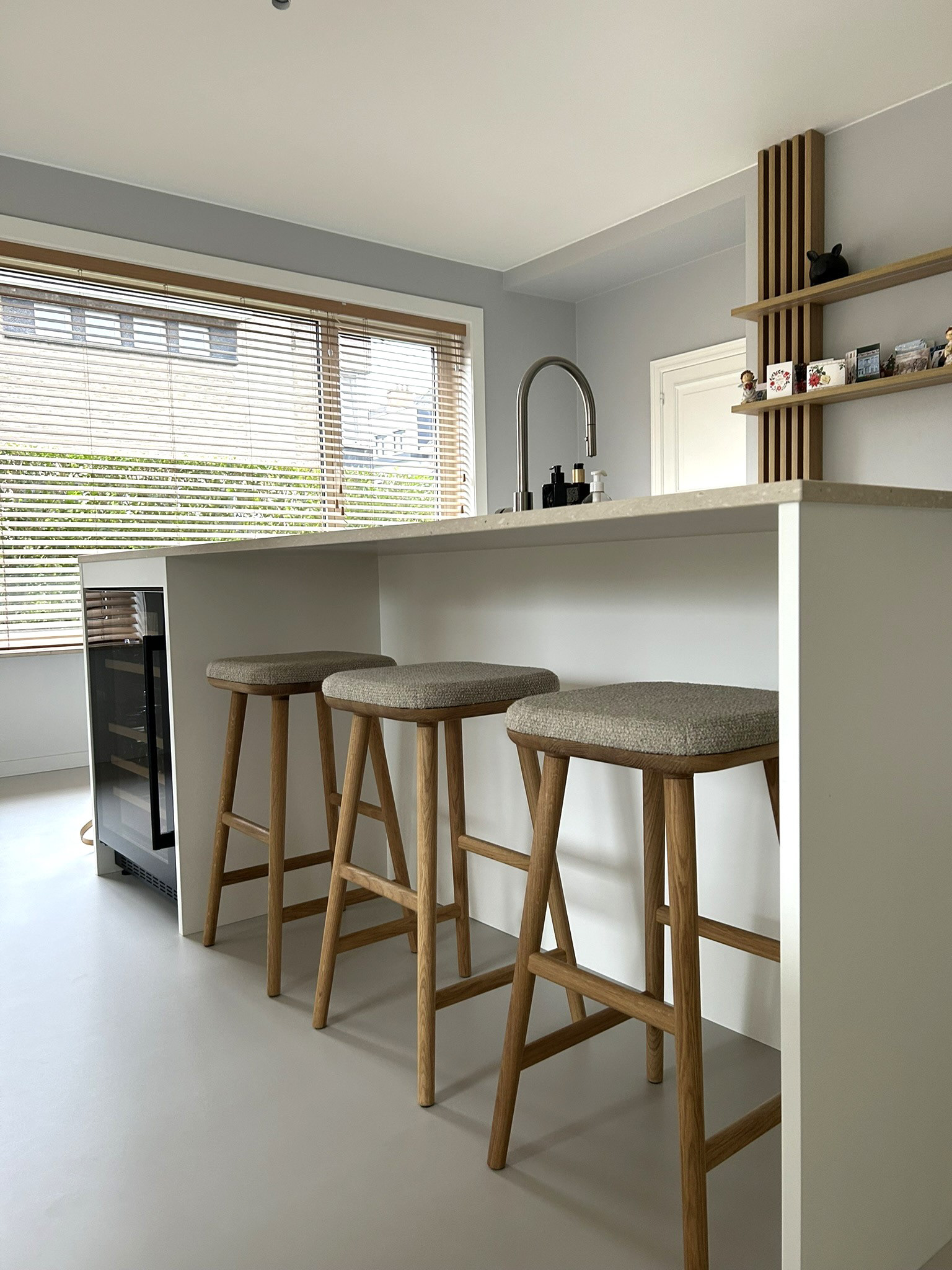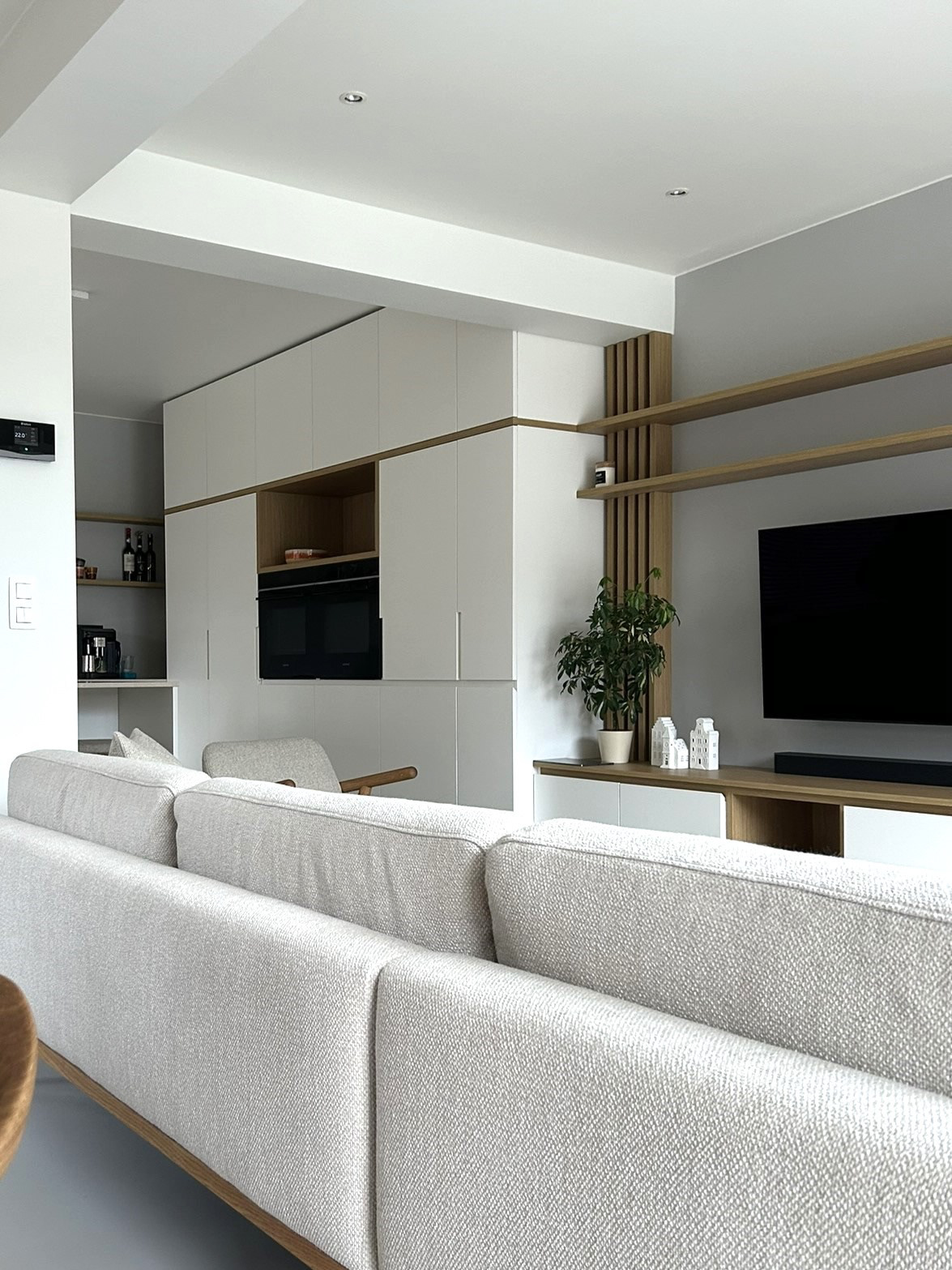 Renovatie van een benedenverdieping met een nieuwe, ruime keuken en maatwerk meubilair.